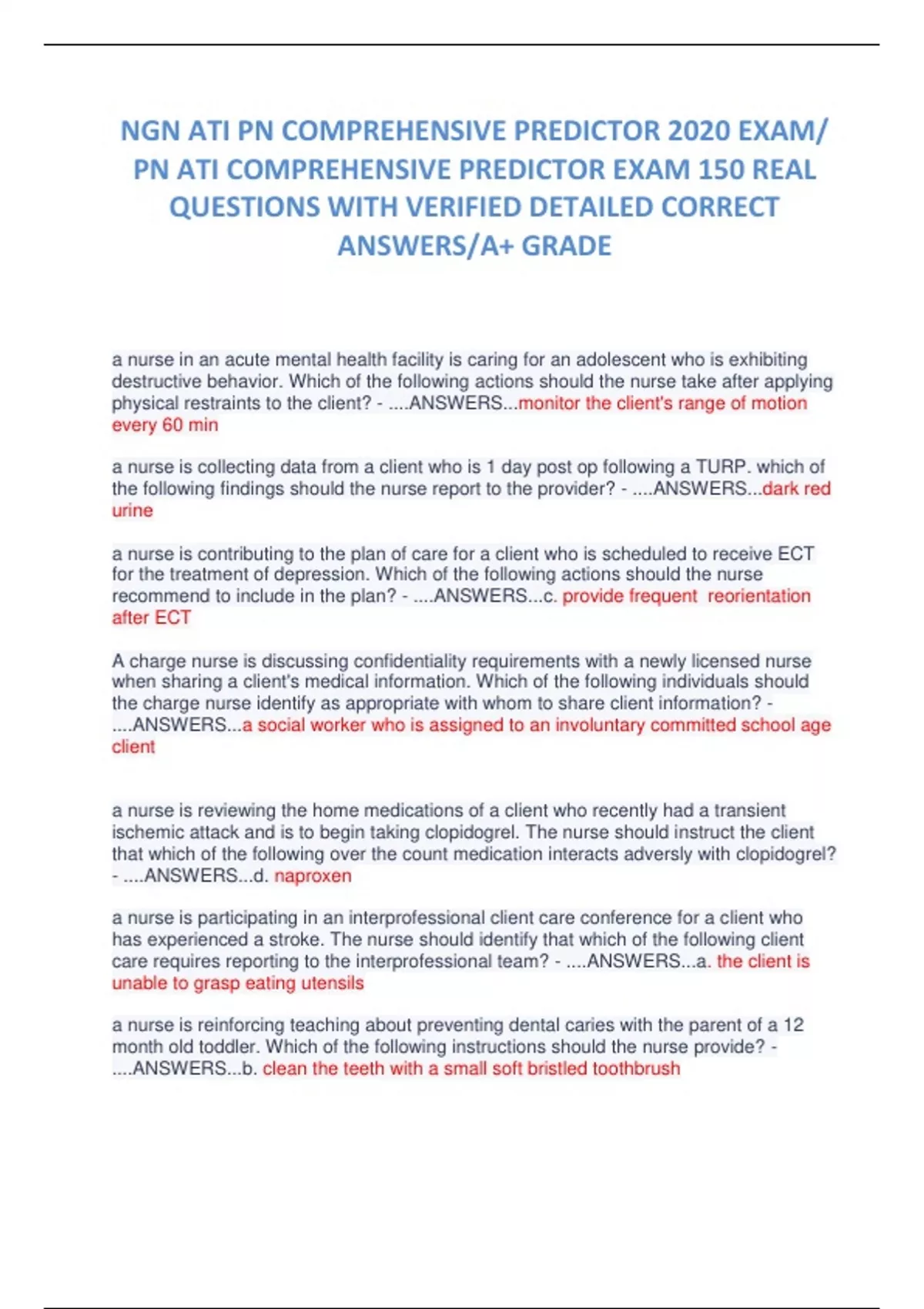 NGN ATI PN COMPREHENSIVE PREDICTOR 2020 EXAM/ PN ATI COMPREHENSIVE PREDICTOR EXAM 150 REAL QUESTIONS WITH VERIFIED DETAILED CORRECT ANSWERS/A+ GRADE