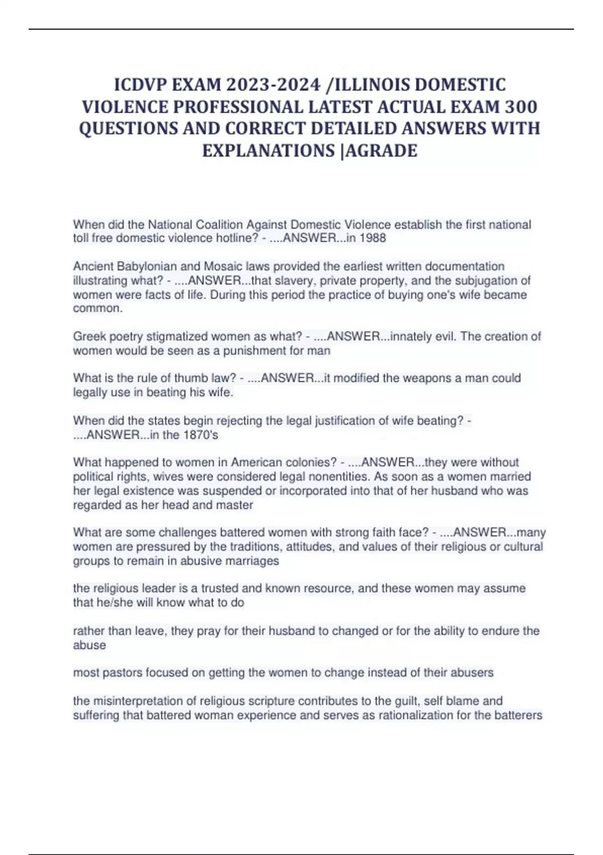 ICDVP EXAM /ILLINOIS DOMESTIC VIOLENCE PROFESSIONAL LATEST ACTUAL EXAM 300 QUESTIONS AND CORRECT DETAILED ANSWERS WITH EXPLANATIONS |AGRADE