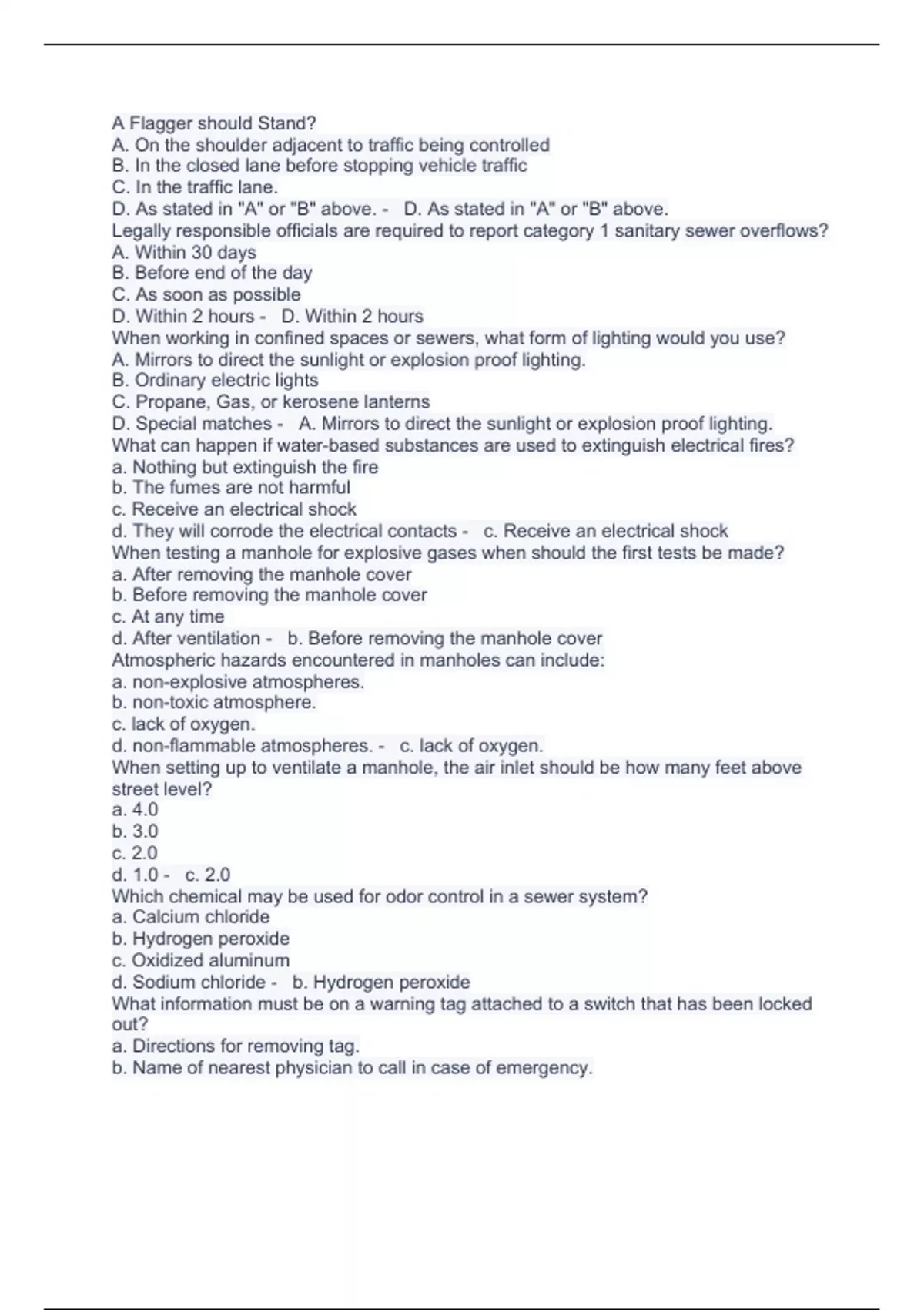 A Flagger should Stand? A. On the shoulder adjacent to traffic being controlled B. In the closed lane before stopping vehicle traffic C. In the traffic lane. D. As stated in "A" or "B" above. - D. As stated in "A" or "B" above. Legally responsible officials are required to report category 1 sanitary sewer overflows? A. Within 30 days B. Before end of the day C. As soon as possible D. Within 2 hours - D. Within 2 hours