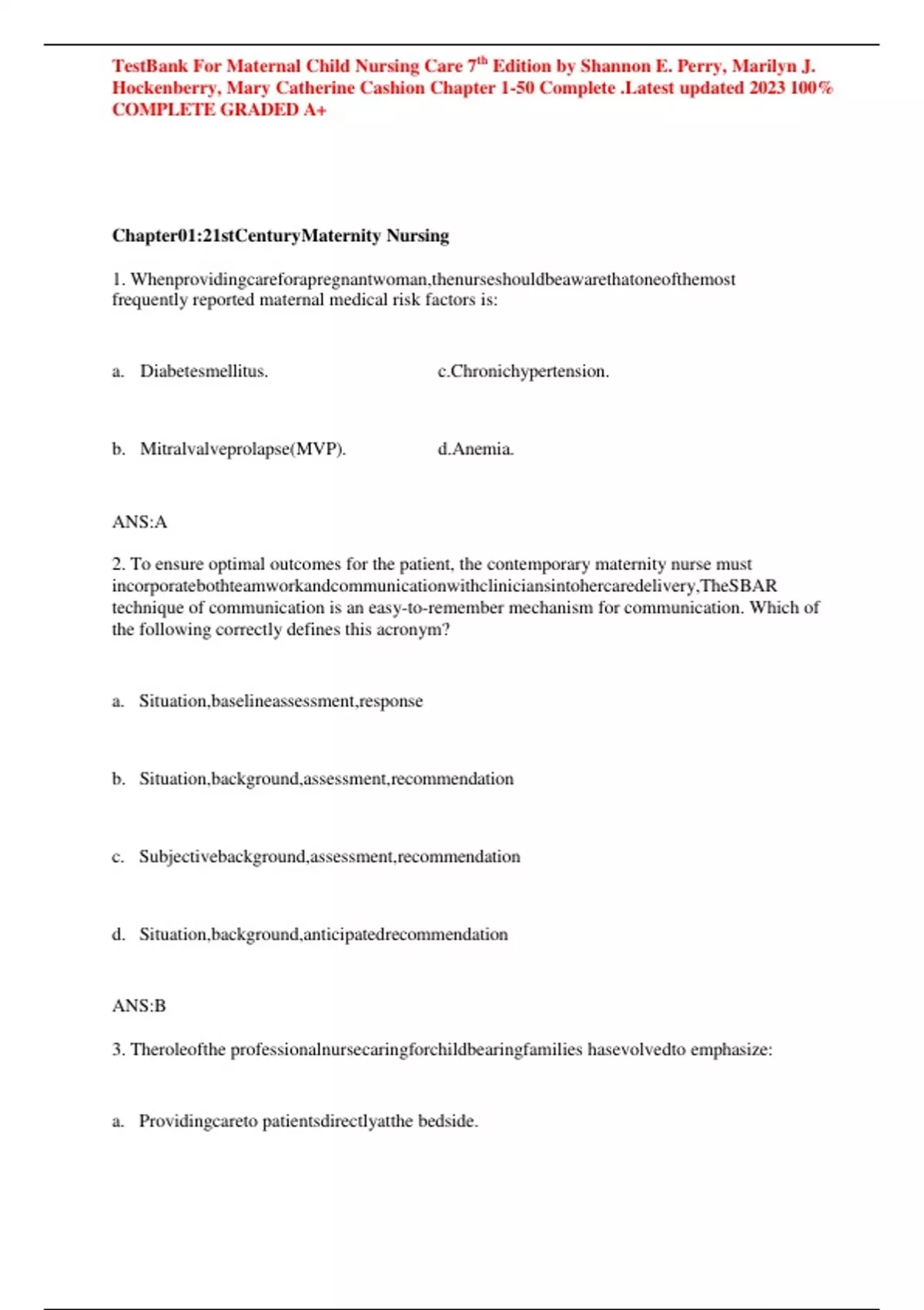 TestBank For Maternal Child Nursing Care 7th Edition by Shannon E. Perry, Marilyn J. Hockenberry, Mary Catherine Cashion Chapter 1-50 Complete .Latest updated 2023 100% COMPLETE GRADED A+