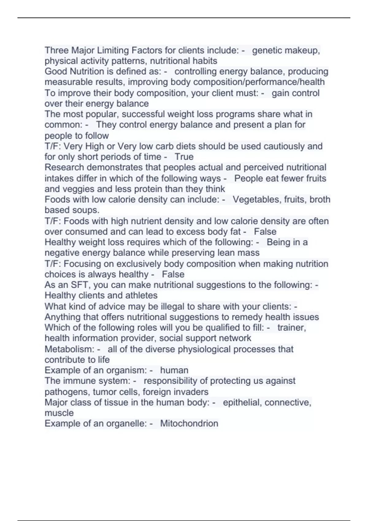 Three Major Limiting Factors for clients include: - genetic makeup, physical activity patterns, nutritional habits Good Nutrition is defined as: - controlling energy balance, producing measurable results, improving body composition/performance/health To improve their body composition, your client must: - gain control over their energy balance