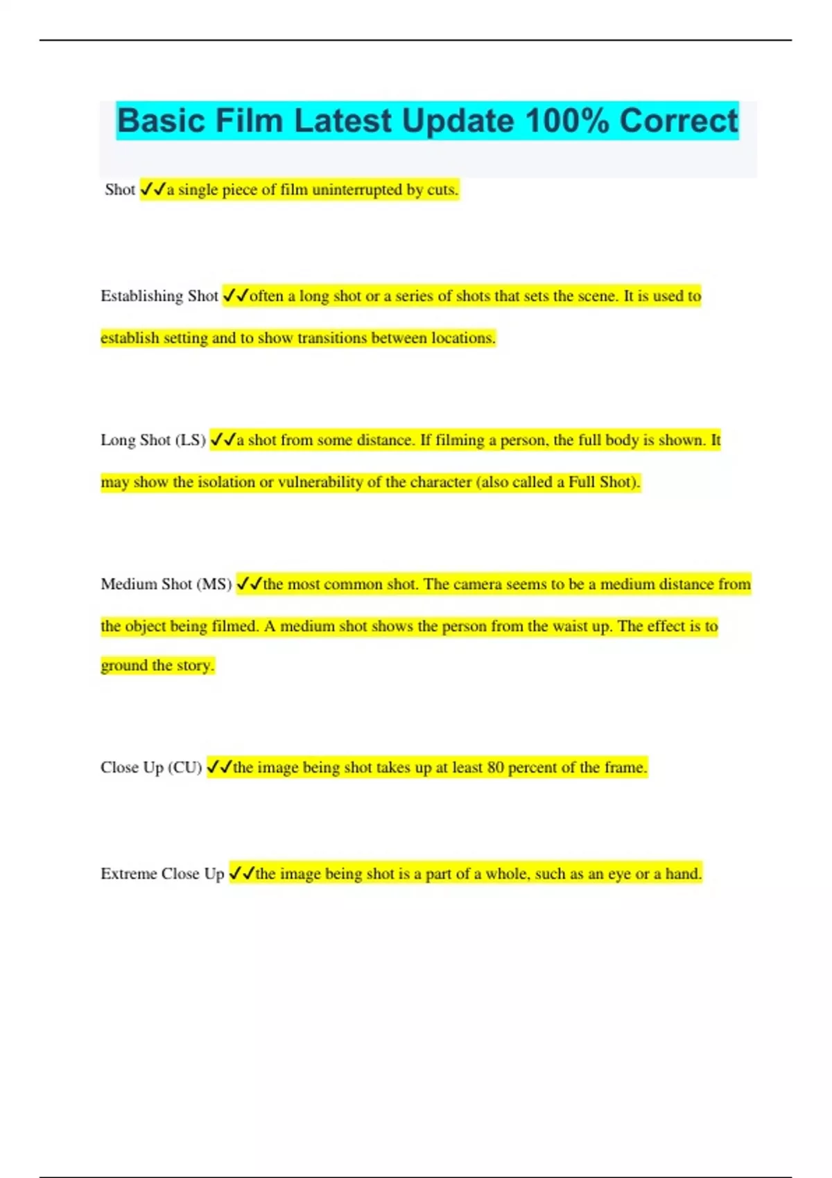 Basic Film Latest Update 100% Correct Shot a single piece of film uninterrupted by cuts. Establishing Shot often a long shot or a series of shots that sets the scene. It is used to establish setting and to show transitions between locations. Long Shot (LS) a shot from some distance. If filming a person, the full body is shown. It may show the isolation or vulnerability of the character (also called a Full Shot). Medium Shot (MS) the most common shot. The camera seems to be a medium distance from the object being filmed. A medium shot shows the person from the waist up. The effect is to ground the story. Close Up (CU) the image being shot takes up at least 80 percent of the frame. Extreme Close Up the image being shot is a part of a whole, such as an eye or a hand. Two Shot a scene between two people shot exclusively from an angle that includes both characters more or less equally. It is used in love scenes where interaction between the two characters is important. Eye Level a shot taken from a normal height; that is, the character's eye level. Ninety to ninety-five percent of the shots seen are eye level, because it is the most natural angle. High Angle the camera is above the subject. This usually has the effect of making the subject look smaller than normal, giving him or her the appearance of being weak, powerless, and trapped. Low Angle the camera films subject from below. This usually has the effect of making the subject look larger than normal, and therefore strong, powerful, and threatening. Pan a stationary camera moves from side to side on a horizontal axis. Tilt a stationary camera moves up or down along a vertical axis Zoom a stationary camera where the lens moves to make an object seem to move closer to or further away from the camera. With this technique, moving into a character is often a personal or revealing movement, while moving away distances or separates the audience from the character. Dolly/Tracking the camera is on a track that allows it to move with the action. The term also refers to any camera mounted on a car, truck, or helicopter. Boom/Crane the camera is on a crane over the action. This is used to create overhead shots. High Key the scene is flooded with light, creating a bright and open-looking scene. Low Key the scene is flooded with shadows and darkness, creating suspense or suspicion. Bottom or Side Lighting direct lighting from below or the side, which often makes the subject appear dangerous or evil. Front or Back Lighting soft lighting on the actor's face or from behind gives the appearance of innocence or goodness, or a halo effect. Cut most common editing technique. Two pieces of film are spliced together to "cut" to another image. Fade can be to or from black or white. A fade can begin in darkness and gradually assume full brightness (fade-in) or the image may gradually get darker (fade-out). A fade often implies that time has passed or may signify the end of a scene. Dissolve a kind of fade in which one image is slowly replaced by another. It can create a connection between images. Wipe a new image wipes off the previous image. A wipe is more fluid than a cut and quicker than a dissolve. Flashback cut or dissolve to action that happened in the past. Shot-Reverse-Shot a shot of one subject, then another, then back to the first. It is often used for conversation or reaction shots. Cross Cutting cut into action that is happening simultaneously. This technique is also called parallel editing. It can create tension or suspense and can form a connection between scenes. Eye-Line Match cut to an object, then to a person. This technique shows what a person seems to be looking at and can reveal a character's thoughts. Diegetic sound that could logically be heard by the characters in the film. Non-Diegetic sound that cannot be heard by the characters but is designed for audience reaction only. An example might be ominous music for foreshadowing. Music/Score/Soundtrack The backing music (instrumental or otherwise) that plays during a movie, nearly always non-diagetic, except in musicals. Voice-Over (VO) A narrative track in which a character or narrator speaks over the action in the film, typically non-diagetic. Cinematography All of the visual elements produced for the scene, such as camera angles, shot types, camera movement, and lighting. Sound All of the audio elements produced for the scene, such as music, sound effects, and dialogue, both diegetic and non-diegetic. Montage All of the edits made to the scene, such as cuts, transitions, scene length. Mis-en-scene Literally "Put in the scene". Everything else in the scene, such as costumes, props, setting, actors, blocking.