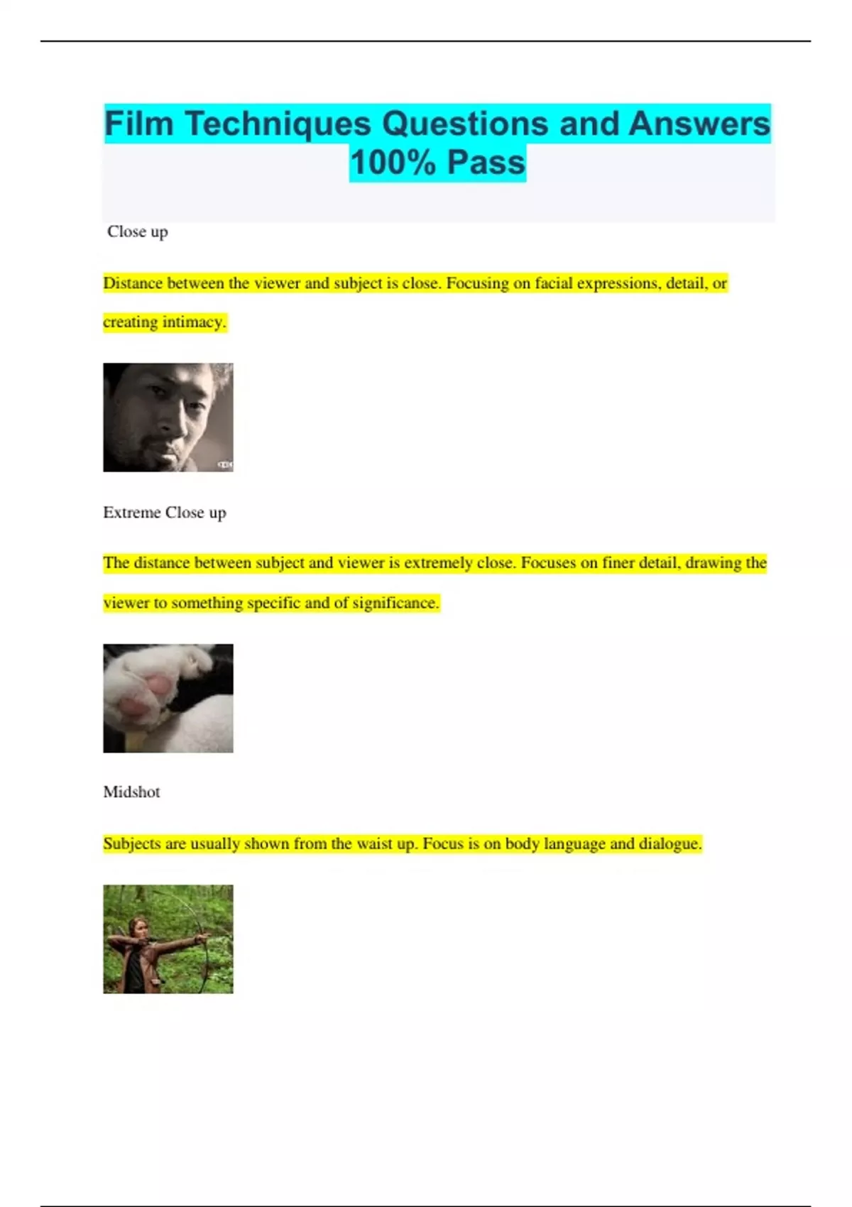Film Techniques Questions and Answers 100% Pass Close up Distance between the viewer and subject is close. Focusing on facial expressions, detail, or creating intimacy. Extreme Close up The distance between subject and viewer is extremely close. Focuses on finer detail, drawing the viewer to something specific and of significance. Midshot Subjects are usually shown from the waist up. Focus is on body language and dialogue. Long Shot Also called a full shot. There is a greater distance between the subject and the viewer. Focus is on action and relationships between characters and the world around them. Extreme Long shot Focus is on scenery, establishing setting and mood. Low angle shot The subject is displayed as powerful or dominant. High angle shot The subject is displayed as weaker or submissive. Establishing shot A shot that is at the beginning of a scene, that shows where the scene will be taking place. mise-en-scene Everything that has been placed in a scene before editing. Adds to realism and accuracy of the scene. Placement of props can be used for symbolic effect. Set Where the scene takes place. Establishes a sense of verisimilitude or can be used as a form of pathetic fallacy. Costume What the actors wear. Provides context clues to character and setting. Props Everything that is placed on the set from chairs to pictures on the wall. Contributes to the mise-en-scene and mood. Lighting This is the use of light, shade, and colour to convey emotional states or influence the mood of the scene. Diegetic sound All the sounds that a character can hear in the film. Non diegetic sound Sounds that are only there for the audience to hear. The characters in the film cannot hear these, such as music and voiceover. Adds to the mood. Soundtrack The music of the film, both diegetic and non-diegetic. Shot A continuous camera shot with no cuts. Cut The change from one camera shot to another. Can be quick (action sequences) or slow fades or transitions. Zoom A camera shot that changes smoothly from a long shot to a close-up or vice versa. Pan A smooth camera movement from left to right or vice versa. Screenplay This is the script, complete with dialogue (words spoken by actors) and stage directions that have been created or adapted from other text by a writer. Special Effects This might include animatronics (computer controlled 3D creatures), computer generated animation/scene creation, models and events like explosions. Director This person leads a team of creative people and directs the actors performance. They are responsible for the final look, style and 'feel' of the film.