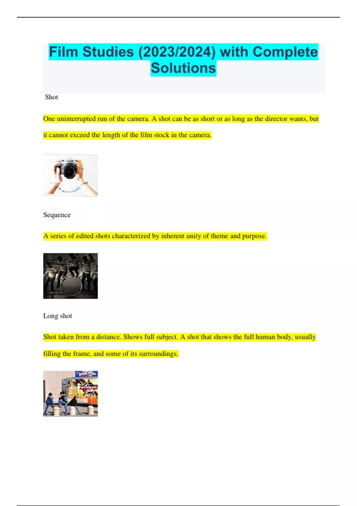 Film Studies (2023/2024) with Complete Solutions Shot One uninterrupted run of the camera. A shot can be as short or as long as the director wants, but it cannot exceed the length of the film stock in the camera. Sequence A series of edited shots characterized by inherent unity of theme and purpose. Long shot Shot taken from a distance. Shows full subject. A shot that shows the full human body, usually filling the frame, and some of its surroundings. Establishing shot Sets the scene or emphasizes setting Close up Image being shot takes up at least 80% of the screen Medium shot Subjects seen from waist up Low key lighting Darkness and shadows. Often create suspense/ suspicion High key lighting Light, bright, open looking. Creates warmth and happiness Neutral lighting Lighting is not intentionally manipulated. Bottom/side lighting Direct lighting from below or side. Associated with secrecy, dangerous or evilness, moral ambiguity, slit personalities Front/rear lighting Direct lighting from front/ behind. Angelic and innocent expression Soft focus Intentional edge blur. Innocence, new life Rack focus When the director shifts the focus from one object to another in the same scene. Changes attention. Signifies power or significance. Deep focus When the foreground and background are in the same focus. Low angle Shooting subject from below. Makes them look important and powerful. Eye level Natural angle. Dutch angle Tilted sideways on a horizontal line. Adds tension to static frame. Sinister/distorted view of character. "Also known as Dutch Shot or oblique-angle shot. A shot in which the