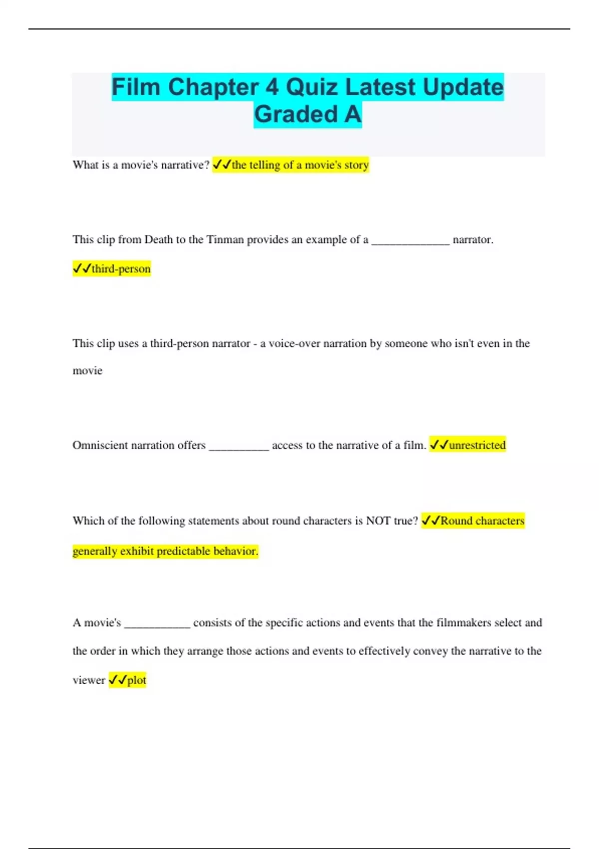 Film Chapter 4 Quiz Latest Update Graded A What is a movie's narrative? the telling of a movie's story This clip from Death to the Tinman provides an example of a _____________ narrator. third-person This clip uses a third-person narrator - a voice-over narration by someone who isn't even in the movie Omniscient narration offers __________ access to the narrative of a film. unrestricted Which of the following statements about round characters is NOT true? Round characters generally exhibit predictable behavior. A movie's ___________ consists of the specific actions and events that the filmmakers select and the order in which they arrange those actions and events to effectively convey the narrative to the viewer plot The total world of a film's _____________ is called its _____________. story; diegesis Which of the following is NOT an example of a nondiegetic element? dialogue Unlike _____________ order, which flows chronologically, _____________ order can be manipulated so that events are presented nonchronologically. story; plot What are the three types of duration identified in this chapter? screen duration; plot duration; story duration The amount of time that the implied story takes to occur is called the _____________. story duration The elapsed time of those events within the story that the film explicitly presents is called the _____________. plot duration A character who interrupts the narrative to speak to the audience watching the film, thus breaking the "fourth wall" that separates the viewer from the two-dimensional fiction on-screen, is delivering _____________. direct address narration Narrative structure is typically characterized by how many acts three When the protagonist faces the seemingly insurmountable obstacle, this is known as the _____________. climax In Psycho (1960), director Alfred Hitchcock shows the viewer, but not detective Arbogast, a shot of Mrs. Bates's bedroom gliding open, before she attacks him with a knife. This storytelling device is known as _____________. suspense The overall range, in time and place, of the movie's story is known as the _____________ of a film. scope A character who pursues a goal and is the central figure of a story but has a dark and hostile nature is called an antagonist. False The inciting incident, or catalyst, occurs when the protagonist faces his or her greatest obstacle. False Screen duration is the amount of time a shot is on-screen. False Watch this clip from Bartholomew's Song and assess the validity of the following statement: The story duration of this scene is approximately 15 seconds. False the story duration is the amount of time that the implied story takes to occur (pp. 136-37). The editing of this scene and use of ellipsis imply the story duration is much longer than 15 seconds.