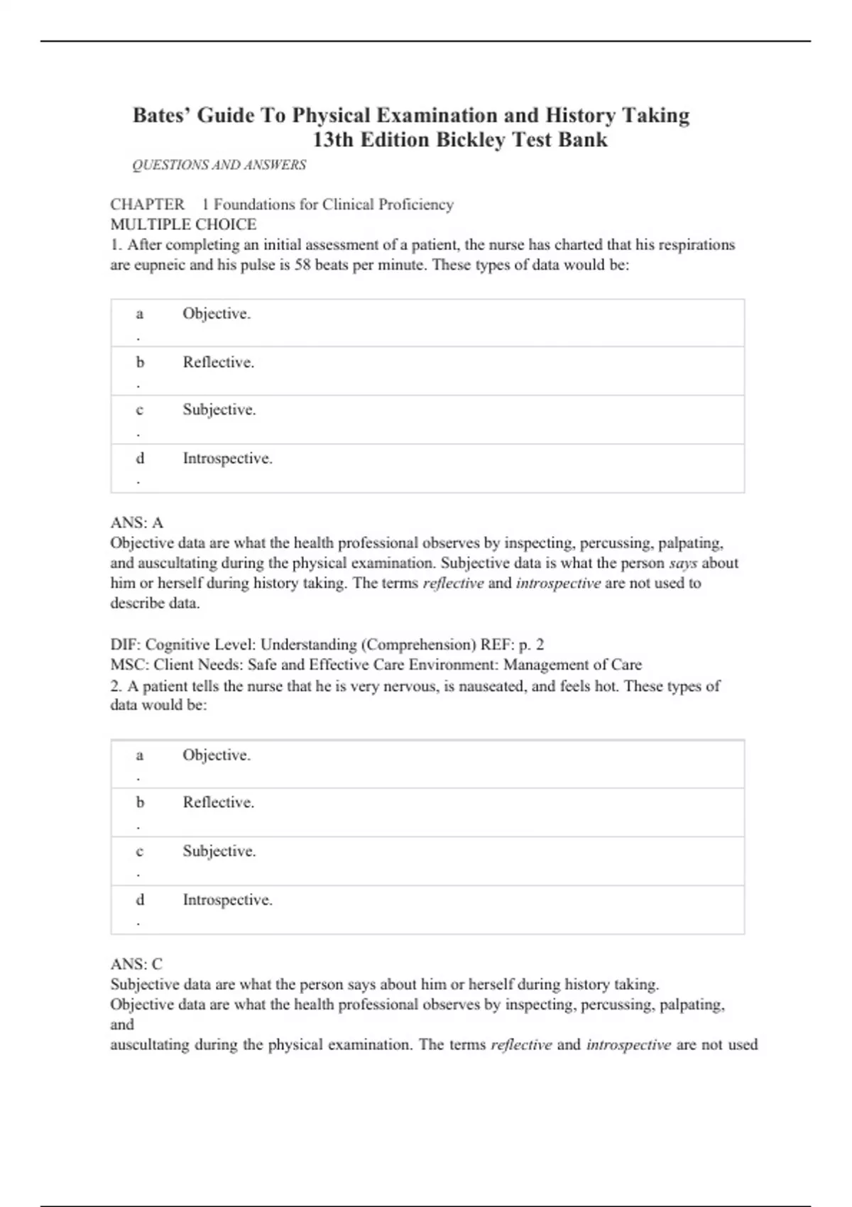 Bates’ Guide To Physical Examination and History Taking 13th Edition Bickley Test Bank After completing an initial assessment of a patient, the nurse has charted that his respirations are eupneic and his pulse is 58 beats per minute. These types of data would be: