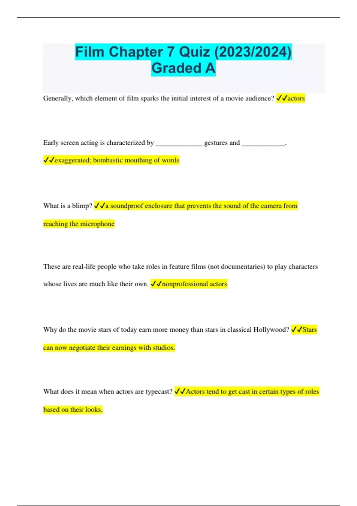 Film Chapter 7 Quiz (2023/2024) Graded A Generally, which element of film sparks the initial interest of a movie audience? actors Early screen acting is characterized by _____________ gestures and ____________. exaggerated; bombastic mouthing of words What is a blimp? a soundproof enclosure that prevents the sound of the camera from reaching the microphone These are real-life people who take roles in feature films (not documentaries) to play characters whose lives are much like their own. nonprofessional actors Why do the movie stars of today earn more money than stars in classical Hollywood? Stars can now negotiate their earnings with studios. What does it mean when actors are typecast? Actors tend to get cast in certain types of roles based on their looks. In Broken Blossoms (1919), the performance of which actress, credited with inventing the art of screen acting, is considered the first great film performance by an actor? Lillian Gish Which naturalistic style of acting encourages actors to speak, move, and gesture not in a traditional stage manner but just as they would in their own lives? the Method Which figure is associated with nonnaturalistic performance? Bertolt Brecht The alienation effect or distancing effect seeks to _____________ the artificiality of performance and _____________ the audience's identification with the characters. draw attention to; limit Which of the following clips is an example of nonnaturalistic performance? Kleingeld Delivering lines based loosely on the written script or without rehearsal is called ____________. improvisation In what situation must actors focus on the communicative power of slight facial gestures while ignoring the expressive potential of their bodies when being filmed in a close-up Which individual is capable of molding a performance with more control than most directors or even the actors themselves? the editor Which movie musical vividly and satirically portrays the process of converting movie production from silent to sound? Singin' in the Rain What made Cary Grant unique among Hollywood actors during classical studio era? He did not have a studio contract. According to two recent polls described in the book, which two actors are among both the most popular and the most likely to positively affect a movie's gross? Jennifer Lawrence and Sandra Bullock Persona is crucial to the career of which of the following actors? Tom Cruise In the studio era, an option contract allowed an actor to drop the option to work at a particular studio and choose to move to another studio after his or her contract expired. False Improvised acting allows directors to play a less active role when working with actors. False