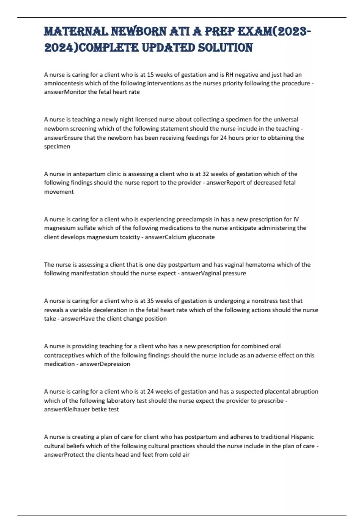 2024)Complete U pdated S olution A nurse is caring for a client who is at 15 weeks of gestation and is RH negative and just had an amniocentesis which of the following interventions as the nurses priority fo llowing the procedure - answerMonitor the fetal heart rate A nurse is teaching a newly night licensed nurse about collecting a specimen for the universal newborn screening which of the following statement should the nurse include in the teaching - answerE nsure that the newborn has been receiving feedings for 24 hours prior to obtaining the specimen A nurse in antepartum clinic is assessing a client who is at 32 weeks of gestation which of the following findings should the nurse report to the provider - answerReport of decreased fetal movement A nurse is caring for a client who is experiencing preeclampsis in has a new prescription for IV magnesium sulfate which of the following medications to the nurse anticipate administering the client develops magnesiu m toxicity - answerCalcium gluconate The nurse is assessing a client that is one day postpartum and has vaginal hematoma which of the following manifestation should the nurse expect - answerVaginal pressure A nurse is caring for a client who is at 35 wee ks of gestation is undergoing a nonstress test that reveals a variable deceleration in the fetal heart rate which of the following actions should the nurse take - answerHave the client change position A nurse is providing teaching for a client who has a n ew prescription for combined oral contraceptives which of the following findings should the nurse include as an adverse effect on this medication - answerDepression A nurse is caring for a client who is at 24 weeks of gestation and has a suspected placent al abruption which of the following laboratory test should the nurse expect the provider to prescribe - answerKleihauer betke test A nurse is creating a plan of care for client who has postpartum and adheres to traditional Hispanic cultural beliefs which of the following cultural practices should the nurse include in the plan of care - answerProtect the clients head and feet from cold air Mater nal Newborn ATI A Prep Exam(2023 -
