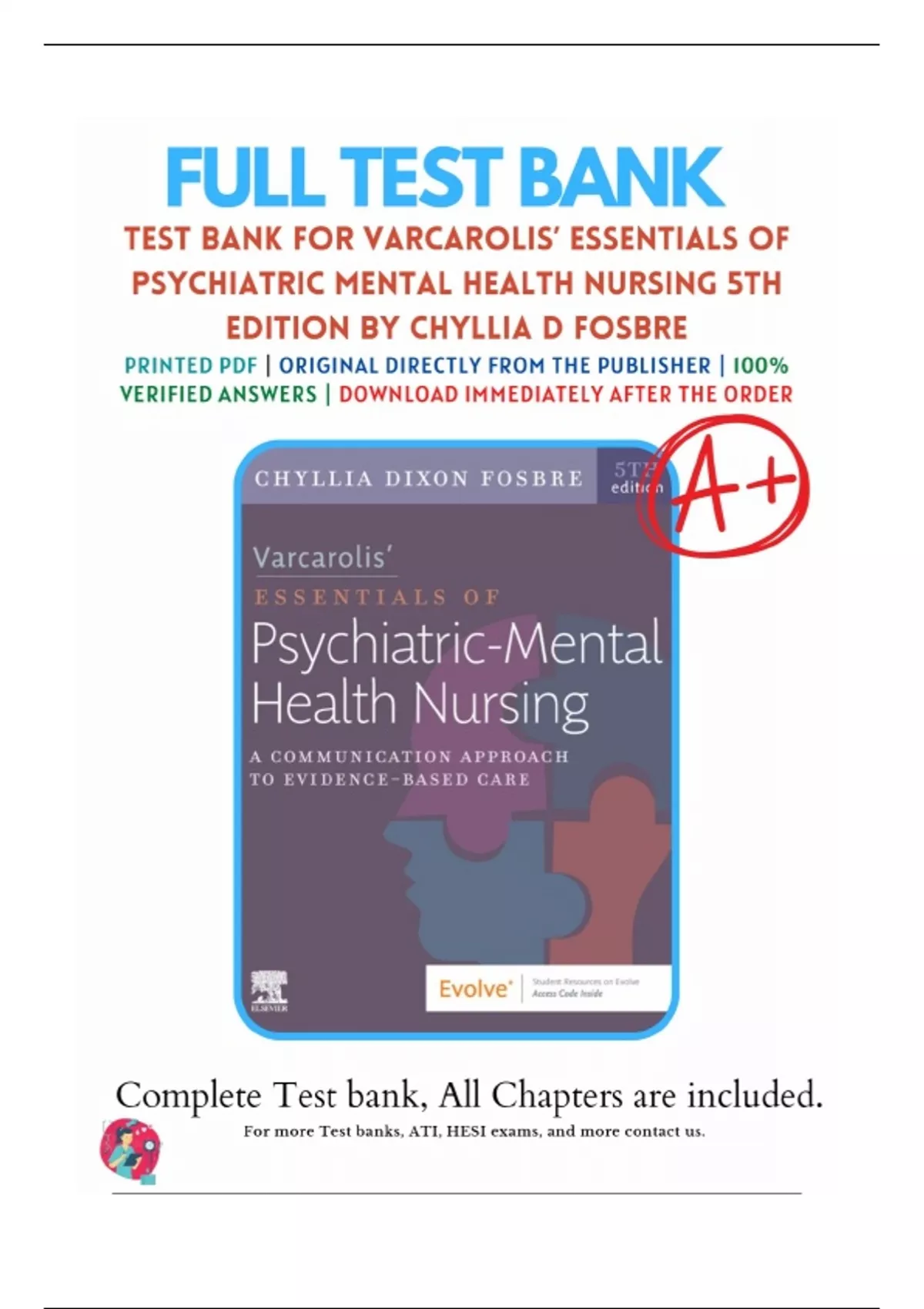 Test Bank For Varcarolis’ Essentials of Psychiatric Mental Health Nursing 5th Edition By Chyllia D Fosbre / ALL Chapters 1-28 /Complete Questions and Answers A+ / 9780323810302 / Get ready for your nursing exams with the comprehensive Test Bank for Varcarolis’ Essentials of Psychiatric Mental Health Nursing 5th Edition by Chyllia D Fosbre. Instantly download a printable PDF packed with original, publisher-approved Questions and Answers covering Chapters 1-28. Ace your tests with complete preparation at your fingertips.