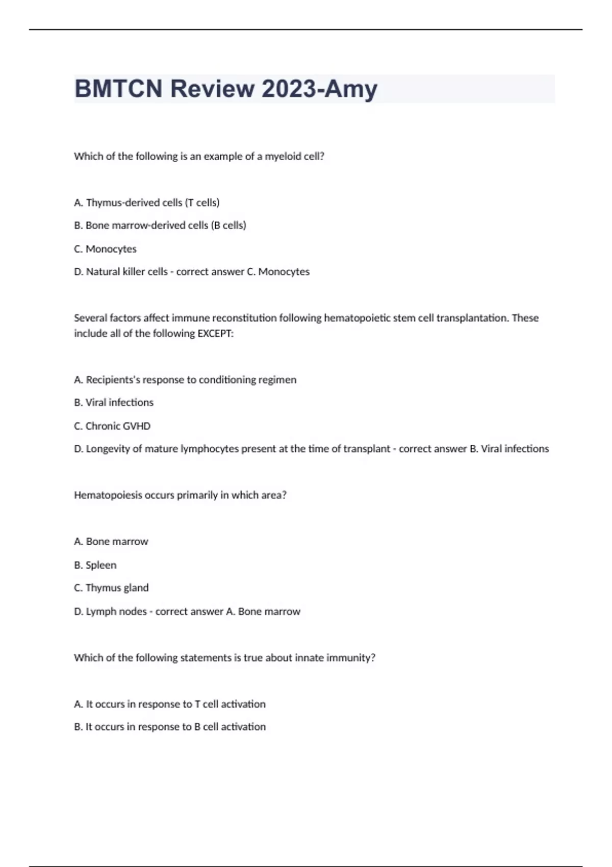 BMTCN Review 2023-Amy Which of the following is an example of a myeloid cell? A. Thymus-derived cells (T cells) B. Bone marrow-derived cells (B cells) C. Monocytes D. Natural killer cells - correct answer C. Monocytes Several factors affect immune reconstitution following hematopoietic stem cell transplantation. These include all of the following EXCEPT: A. Recipients's response to conditioning regimen B. Viral infections C. Chronic GVHD D. Longevity of mature lymphocytes present at the time of transplant - correct answer B. Viral infections Hematopoiesis occurs primarily in which area? A. Bone marrow B. Spleen C. Thymus gland D. Lymph nodes - correct answer A. Bone marrow Which of the following statements is true about innate immunity? A. It occurs in response to T cell activation B. It occurs in response to B cell activation C. It is a natural process that uses phagocytes that release inflammatory mediators in response to infections or illness D. It is a natural process that occurs primarily in the spleen - correct answer C. It is a natural process that uses phagocytes that release inflammatory mediators in response to infections or illness Which is NOT a common indication for Allogeneic transplantation? A. Acute myeloid leukemia B. Myelodysplastic syndrome C. Chronic myeloid leukemia D. Breast cancer - correct answer D. Breast cancer Graft-versus-tumor effect is promoted by which of the following? A. Withdrawal of immunosuppressive therapy B. Administration of donor leukocyte infusion C. A and B D. Increased dose of immunosuppressive therapy - correct answer C. A and B Which of the following is NOT a role of a caregiver? A. Provide physical and emotional support B. Assist with recovery following HSCT C. Assist with medication administration D. Recommend over-the -counter medications for management of post-HSCT symptoms - correct answer D. Recommend over-the-counter medications for management of post-HSCT symptoms MJ is to undergo an autologous transplant. From whom will he receive his stem cells? A. A matched related donor