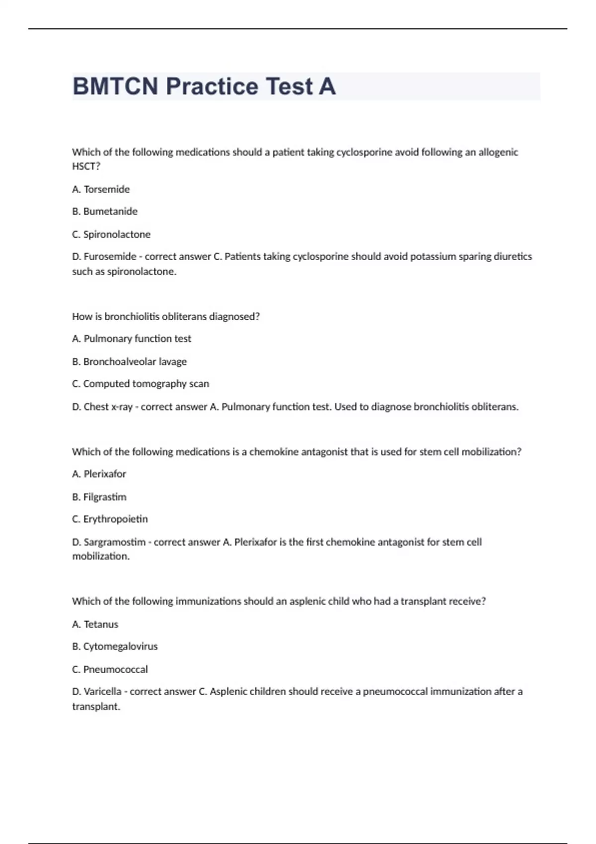 BMTCN Practice Test AWhich of the following medications should a patient taking cyclosporine avoid following an allogenic HSCT? A. Torsemide B. Bumetanide C. Spironolactone D. Furosemide - correct answer C. Patients taking cyclosporine should avoid potassium sparing diuretics such as spironolactone. How is bronchiolitis obliterans diagnosed? A. Pulmonary function test B. Bronchoalveolar lavage C. Computed tomography scan D. Chest x-ray - correct answer A. Pulmonary function test. Used to diagnose bronchiolitis obliterans. Which of the following medications is a chemokine antagonist that is used for stem cell mobilization? A. Plerixafor B. Filgrastim C. Erythropoietin D. Sargramostim - correct answer A. Plerixafor is the first chemokine antagonist for stem cell mobilization. Which of the following immunizations should an asplenic child who had a transplant receive? A. Tetanus B. Cytomegalovirus C. Pneumococcal D. Varicella - correct answer C. Asplenic children should receive a pneumococcal immunization after a transplant. Why is the additive DMSO used during stem cell processing? A. Prevents cell damage during the freezing and thawing of autologous stem cells. B. Facilitates purging of malignant cells in autologous transplants C. Prevents GVHD by removing cytokines from mismatched stem cells D. Prevents coagulation in bags of unrelated fresh bone marrow and stem cells - correct answer A. DMSO is an additive used to prevent damage to cells during freezing or thawing. How many days should lapse between dental extraction and the start of conditioning? A. 28 to 30 days B. 10 to 14 days C. 5 to 7 days D. 18 to 21 days - correct answer B. In order to prevent potential complications, dental extraction and healing should be complete 10 to 14 days prior to beginning a conditioning regimen or transplantation. Immunoglobulins are secreted by which type of cell? A. Natural Killer B. Megakaryocyte C. B-Lymphocyte D. T-Lymphocyte - correct answer C. B-Lymphocytes synthesize and secrete immunoglobulins. What is a female patient experiencing who begins to have a dense, coarse, and excessive hair growth on the face, neck, and chest after taking vincristine? A. Hirsutism B. Paronychia C. Trichomegaly D. Hyperpigmentation - correct answer A. Hirsutism is the term for abnormal hair growth that follows a number of chemotherapy drugs. How should the healthcare team address the psychosocial needs of transplant patients and caregivers?
