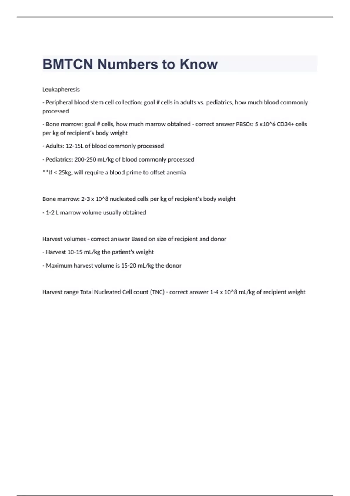 BMTCN Numbers to KnowLeukapheresis - Peripheral blood stem cell collection: goal # cells in adults vs. pediatrics, how much blood commonly processed - Bone marrow: goal # cells, how much marrow obtained - correct answer PBSCs: 5 x10^6 CD34+ cells per kg of recipient's body weight - Adults: 12-15L of blood commonly processed - Pediatrics: 200-250 mL/kg of blood commonly processed **If < 25kg, will require a blood prime to offset anemia Bone marrow: 2-3 x 10^8 nucleated cells per kg of recipient's body weight - 1-2 L marrow volume usually obtained Harvest volumes - correct answer Based on size of recipient and donor - Harvest 10-15 mL/kg the patient's weight - Maximum harvest volume is 15-20 mL/kg the donor Harvest range Total Nucleated Cell count (TNC) - correct answer 1-4 x 10^8 mL/kg of recipient weight