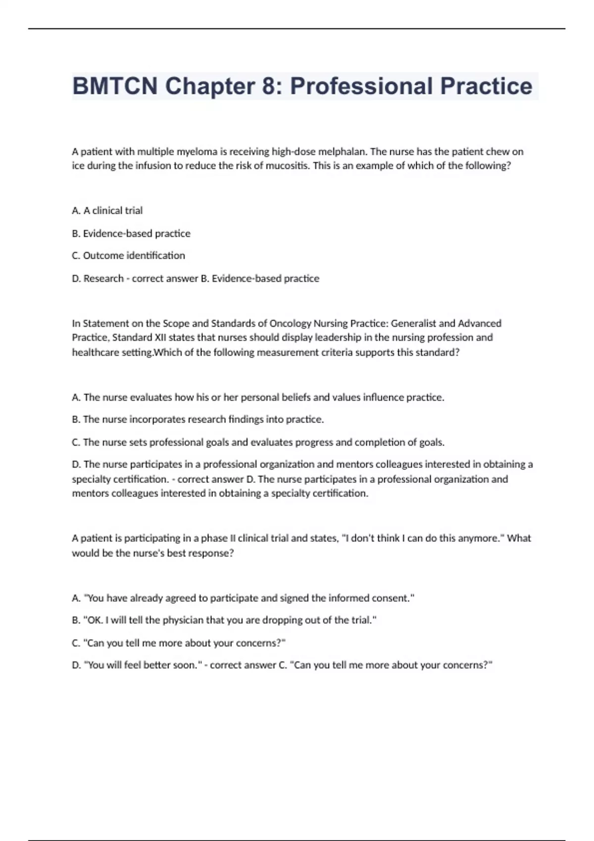 BMTCN Chapter 8 Professional PracticeA patient with multiple myeloma is receiving high-dose melphalan. The nurse has the patient chew on ice during the infusion to reduce the risk of mucositis. This is an example of which of the following? A. A clinical trial B. Evidence-based practice C. Outcome identification D. Research - correct answer B. Evidence-based practice In Statement on the Scope and Standards of Oncology Nursing Practice: Generalist and Advanced Practice, Standard XII states that nurses should display leadership in the nursing profession and healthcare setting.Which of the following measurement criteria supports this standard? A. The nurse evaluates how his or her personal beliefs and values influence practice. B. The nurse incorporates research findings into practice. C. The nurse sets professional goals and evaluates progress and completion of goals. D. The nurse participates in a professional organization and mentors colleagues interested in obtaining a specialty certification. - correct answer D. The nurse participates in a professional organization and mentors colleagues interested in obtaining a specialty certification. A patient is participating in a phase II clinical trial and states, "I don't think I can do this anymore." What would be the nurse's best response? A. "You have already agreed to participate and signed the informed consent." B. "OK. I will tell the physician that you are dropping out of the trial." C. "Can you tell me more about your concerns?" D. "You will feel better soon." - correct answer C. "Can you tell me more about your concerns?" A patient with grade IV gastrointestinal graft-versus-host disease states that he does not want to receive parenteral nutrition, but his wife disagrees with his decision. The wife states, "You can't let my husband starve to death."What ethical principle applies in this situation? A. Respect for autonomy B. Nonmaleficence C. Confidentiality D. Privacy - correct answer B. Nonmaleficence An advanced practice hematopoietic stem cell transplantation (HSCT) nurse is going to move from Texas to Indiana and would like to determine the requirements for licensure in Indiana. What would be the best resource? A. The policies and procedures at the hiring hospital B. The state's nurse practice act C. A national professional nursing organization D. The Foundation for the Accreditation of Cellular Therapy - correct answer C. A national professional nursing organization Because of an increase in central line-associated bloodstream infections in HSCT patients, an advanced practice nurse formed an interdisciplinary team. The team established a goal and analyzed current data, practice, research, and guidelines. What would be the next step? A. Continue to collect data. B. Apply for a grant to study central line-associated bloodstream infections in HSCT recipients. C. Select a change in practice or process. D. Define central line-associated bloodstream infections. - correct answer C. Select a change in practice or process. Which of the following is a violation of professional boundaries? A. The nurse stays after his or her scheduled shift to assist with a bone marrow biopsy.