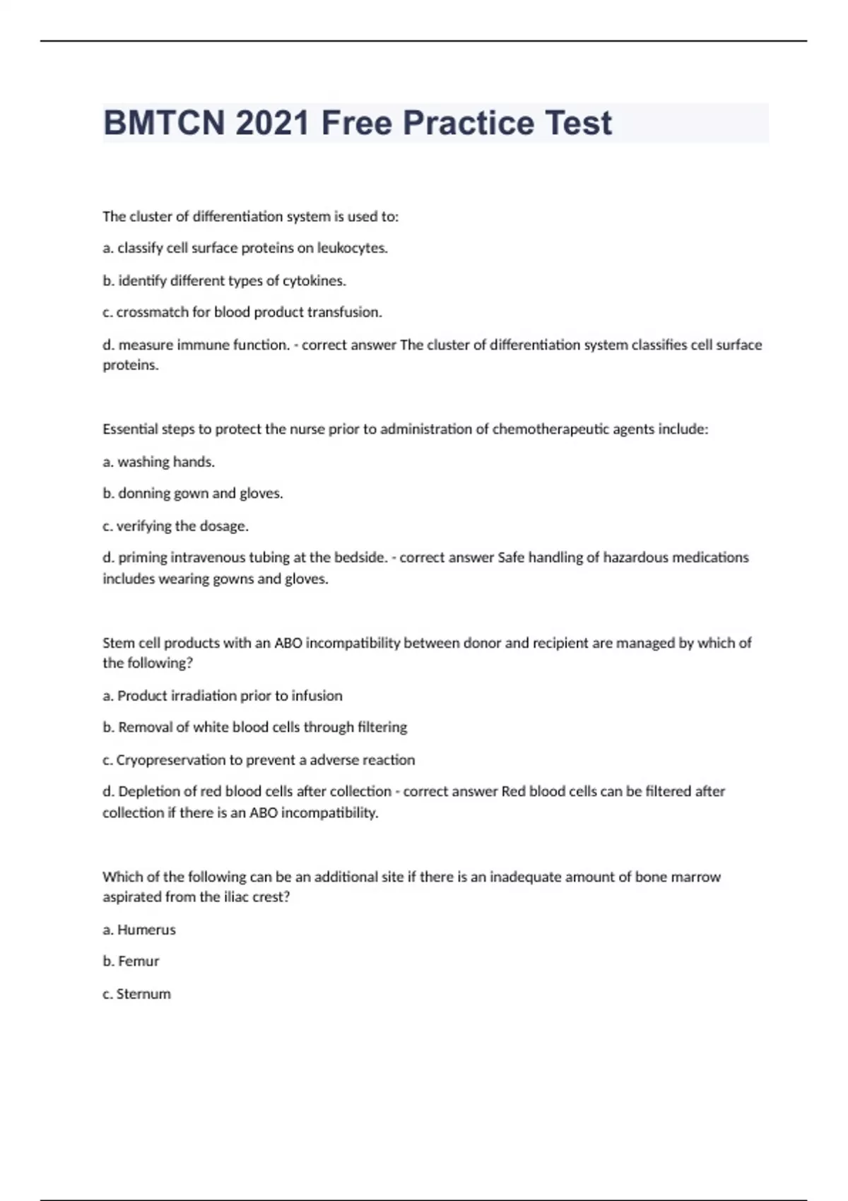 BMTCN 2021 Free Practice Test The cluster of differentiation system is used to: a. classify cell surface proteins on leukocytes. b. identify different types of cytokines. c. crossmatch for blood product transfusion. d. measure immune function. - correct answer The cluster of differentiation system classifies cell surface proteins. Essential steps to protect the nurse prior to administration of chemotherapeutic agents include: a. washing hands. b. donning gown and gloves. c. verifying the dosage. d. priming intravenous tubing at the bedside. - correct answer Safe handling of hazardous medications includes wearing gowns and gloves. Stem cell products with an ABO incompatibility between donor and recipient are managed by which of the following? a. Product irradiation prior to infusion b. Removal of white blood cells through filtering c. Cryopreservation to prevent a adverse reaction d. Depletion of red blood cells after collection - correct answer Red blood cells can be filtered after collection if there is an ABO incompatibility. Which of the following can be an additional site if there is an inadequate amount of bone marrow aspirated from the iliac crest? a. Humerus b. Femur c. Sternum d. Coccyx - correct answer If there is an insufficient number of stem cells from the iliac crest, the sternum can be used. Which of the following factors increases the risk of squamous cell carcinoma following transplant? a. History of non-Hodgkin lymphoma b. History of acute myelogenous leukemia c. Underlying diagnosis of Fanconi anemia d. Previous diagnosis of aGVHD - correct answer Patients with FA have a predisposition to squamous cell carcinoma following transplant. Cataract development post transplant is linked to which of the following treatment regimens? a. Fludarabine b. Etoposide c. Carboplatin d. TBI - correct answer Patients who have received TBI are at risk for the development of cataracts. When providing information to a patient diagnosed with cutaneous chronic graft versus host disease, the nurse emphasizes: a. that steroid creams are ineffective. b. there is not an increased risk of infection during treatment. c. the importance of tapering steroid medications. d. the importance of using sunscreen with adequate SPF barrier. - correct answer Sun exposure will exacerbate/activate cutaneous GVHD. The caregiver of a patient at a clinic visit reports witnessing unusual and aggressive behavior, sleep problems, and sadness. The nurse believes the patient may be exhibiting signs of: a. posterior reversible encephalopathy syndrome. b. bipolar disorder. c. tacrolimus toxicity. d. post traumatic stress disorder. - correct answer PTSD can manifest itself as unusual and aggressive behaviors, and sleep disorders.