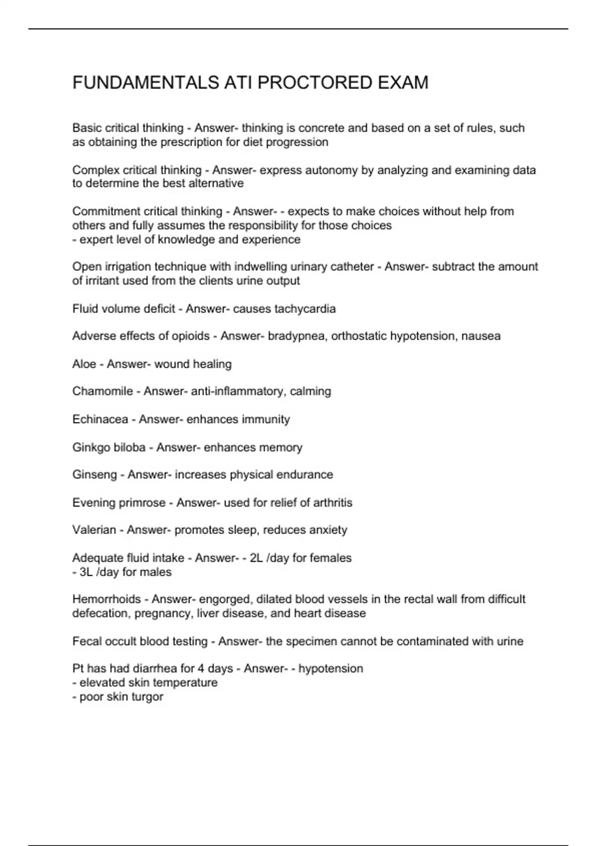 Basic critical thinking - Answer- thinking is concrete and based on a set of rules, such as obtaining the prescription for diet progression Complex critical thinking - Answer- express autonomy by analyzing and examining data to determine the best alternative Commitment critical thinking - Answer- - expects to make choices without help from others and fully assumes the responsibility for those choices - expert level of knowledge and experience Open irrigation technique with indwelling urinary catheter - Answer- subtract the amount of irritant used from the clients urine output Fluid volume deficit - Answer- causes tachycardia Adverse effects of opioids - Answer- bradypnea, orthostatic hypotension, nausea Aloe - Answer- wound healing Chamomile - Answer- anti-inflammatory, calming Echinacea - Answer- enhances immunity Ginkgo biloba - Answer- enhances memory Ginseng - Answer- increases physical endurance Evening primrose - Answer- used for relief of arthritis Valerian - Answer- promotes sleep, reduces anxiety Adequate fluid intake - Answer- - 2L /day for females - 3L /day for males Hemorrhoids - Answer- engorged, dilated blood vessels in the rectal wall from difficult defecation, pregnancy, liver disease, and heart disease Fecal occult blood testing - Answer- the specimen cannot be contaminated with urine Pt has had diarrhea for 4 days - Answer- - hypotension - elevated skin temperature - poor skin turgor