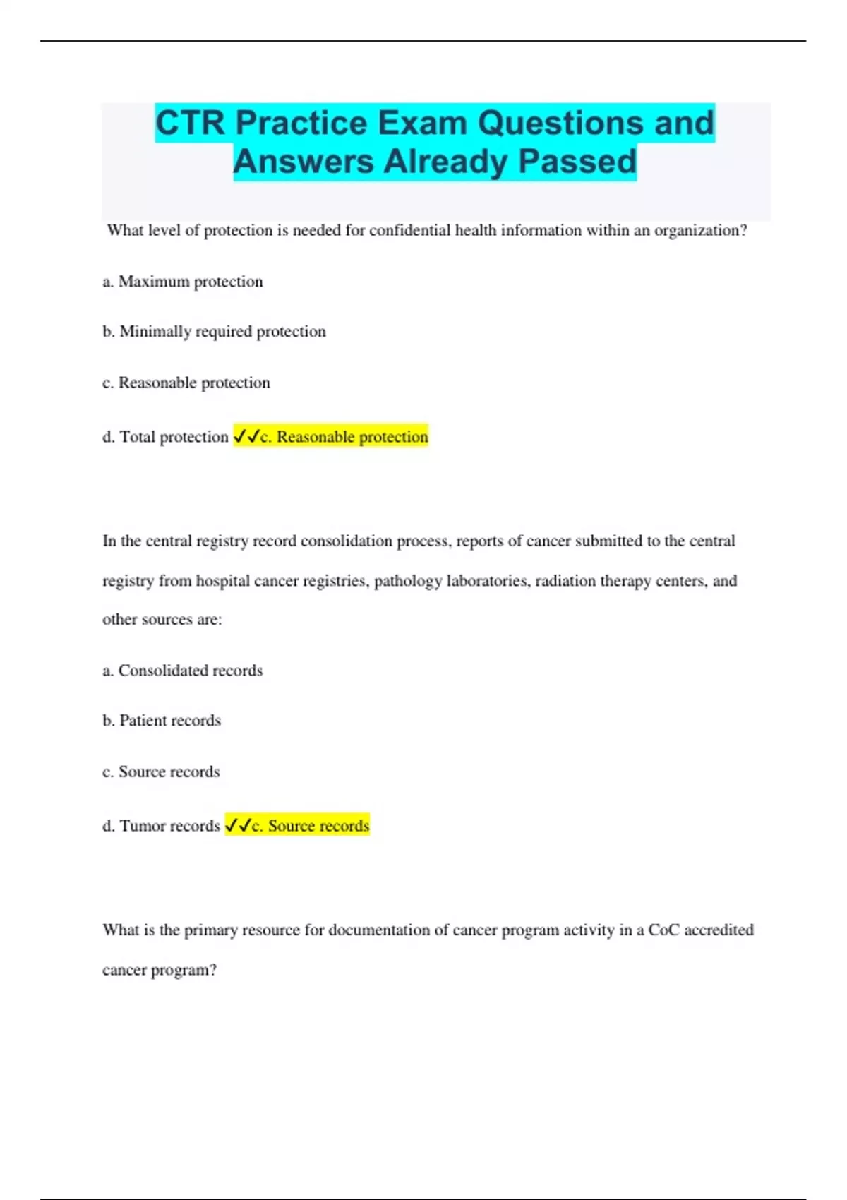 CTR Practice Exam Questions and Answers Already Passed What level of protection is needed for confidential health information within an organization? a. Maximum protection b. Minimally required protection c. Reasonable protection d. Total protection c. Reasonable protection In the central registry record consolidation process, reports of cancer submitted to the central registry from hospital cancer registries, pathology laboratories, radiation therapy centers, and other sources are: a. Consolidated records b. Patient records c. Source records d. Tumor records c. Source records What is the primary resource for documentation of cancer program activity in a CoC accredited cancer program? a. Cancer committee minutes b. Policy and procedure manual c. Post survey evaluation d. Survey application record a. Cancer committee minutes Central Registry A matched its data with data from the Department of Motor Vehicles in state A to determine date last alive for patients in the database. This process is: a. Case ascertainment b. Data linkage c. Death clearance d. Record consolidation b. Data linkage Peyer patches are often located in which organ? a. Bladder b. Brain c. Kidney d. Small intestine d. Small intestine What is the class of case for a patient who was diagnosed and received beam radiation for painful bone metastasis at the reporting facility? a. 00 b. 14 c. 22 d. 31 b. 14 Tumor histology is rhabdomyosarcoma. Primary site is most likely: a. Blood vessel b. Bone c. Skeletal muscle d. Uterus c. Skeletal muscle What is a pathological staging system based on resection of the tumor and measures the depth of invasion through the mucosa and bowel wall? a. Ann Arbor b. Breslow's depth of invasion c. Duke's d. Whitmore c. Duke's To be compliant with Standard 4.8 Quality Improvements, who needs to be notified of the patient care improvements each year? a. Pharmacy b. Quality Improvement Department c. Risk Management d. Medical Staff and Administration d. Medical Staff and Administration The following data set is ages of patients diagnosed with