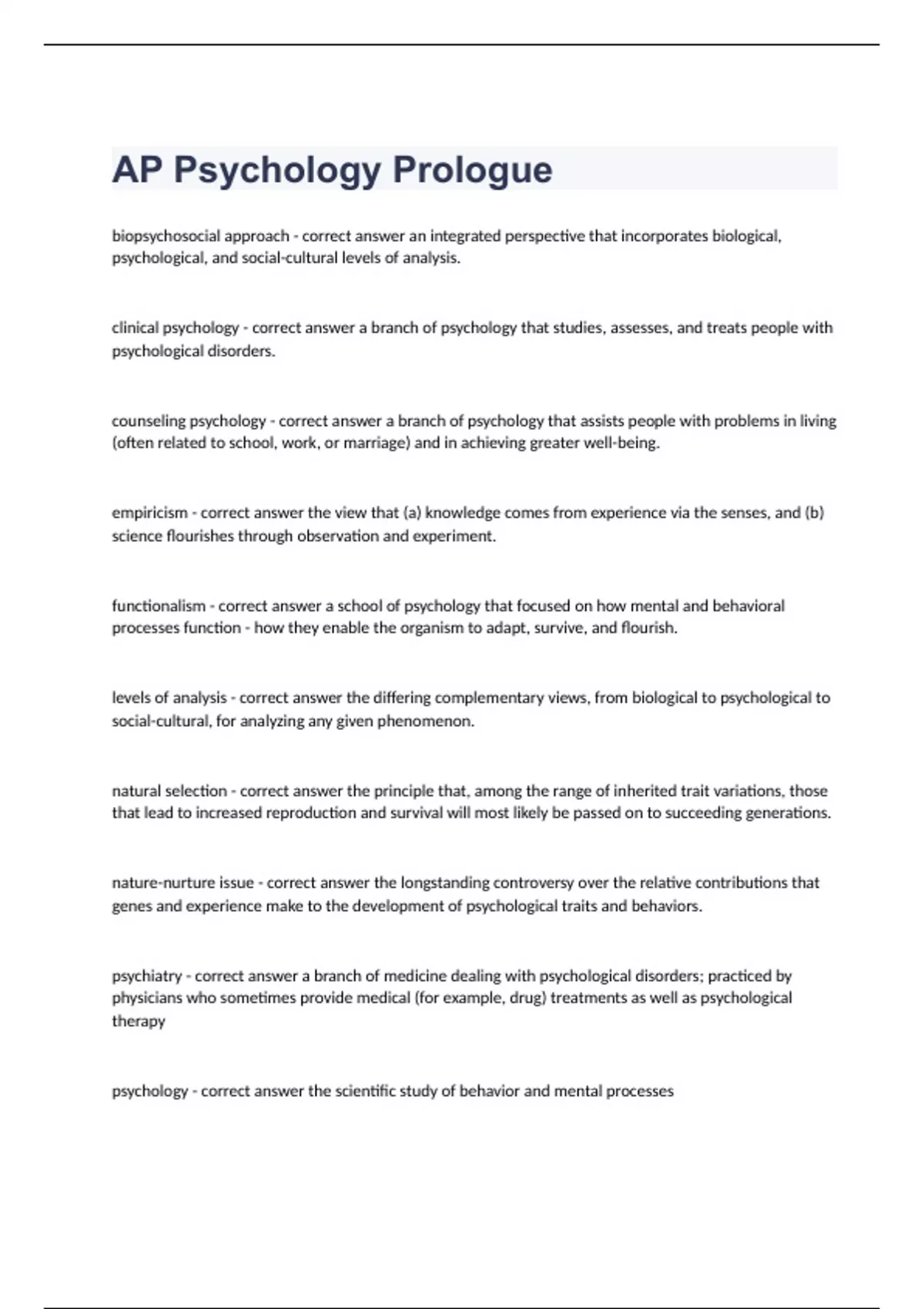 AP Psychology Prologuebiopsychosocial approach - correct answer an integrated perspective that incorporates biological, psychological, and social-cultural levels of analysis. clinical psychology - correct answer a branch of psychology that studies, assesses, and treats people with psychological disorders. counseling psychology - correct answer a branch of psychology that assists people with problems in living (often related to school, work, or marriage) and in achieving greater well-being. empiricism - correct answer the view that (a) knowledge comes from experience via the senses, and (b) science flourishes through observation and experiment. functionalism - correct answer a school of psychology that focused on how mental and behavioral processes function - how they enable the organism to adapt, survive, and flourish. levels of analysis - correct answer the differing complementary views, from biological to psychological to social-cultural, for analyzing any given phenomenon. natural selection - correct answer the principle that, among the range of inherited trait variations, those that lead to increased reproduction and survival will most likely be passed on to succeeding generations. nature-nurture issue - correct answer the longstanding controversy over the relative contributions that genes and experience make to the development of psychological traits and behaviors. psychiatry - correct answer a branch of medicine dealing with psychological disorders; practiced by physicians who sometimes provide medical (for example, drug) treatments as well as psychological therapy psychology - correct answer the scientific study of behavior and mental processes