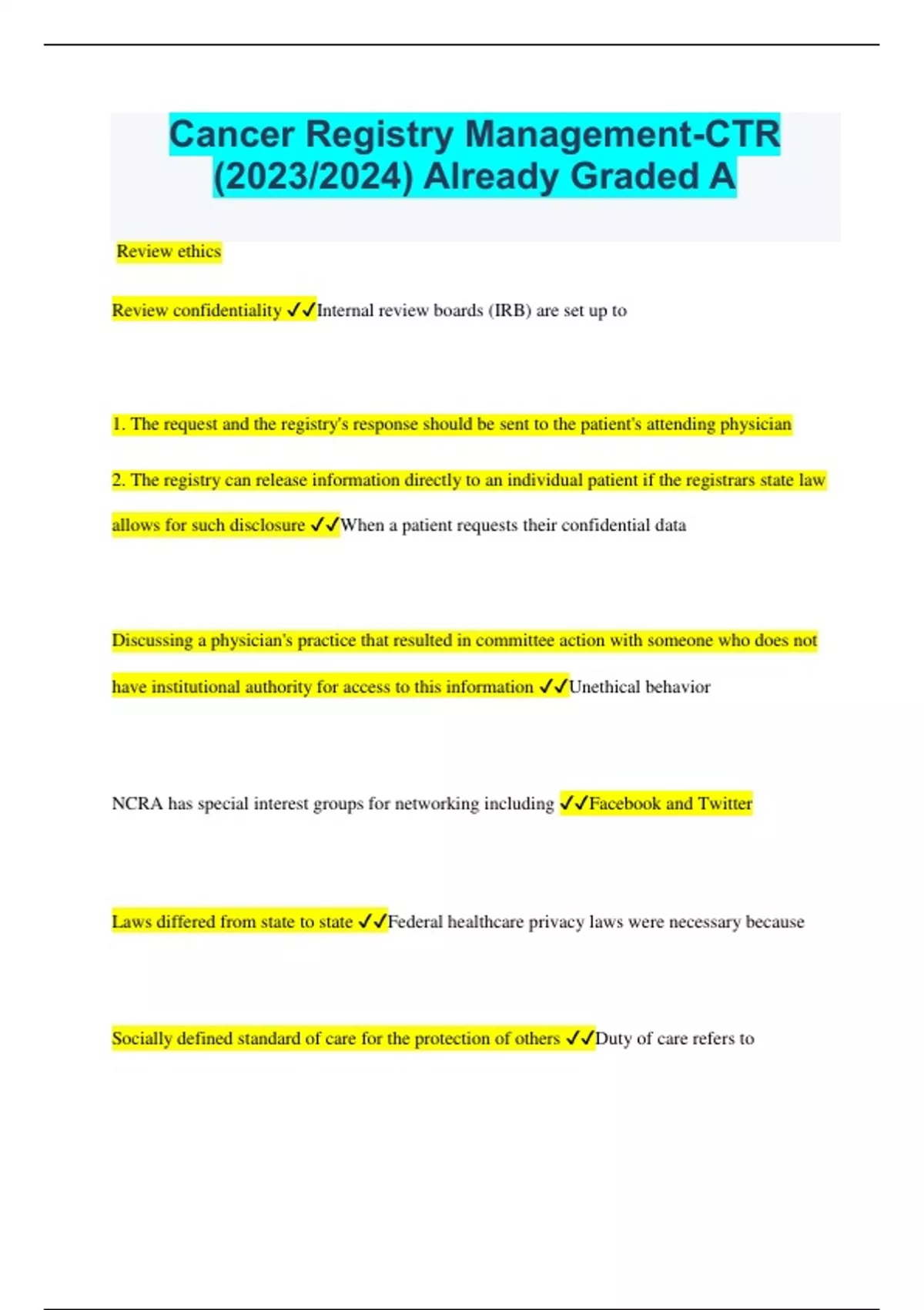 Cancer Registry Management-CTR (2023/2024) Already Graded A Review ethics Review confidentiality Internal review boards (IRB) are set up to 1. The request and the registry's response should be sent to the patient's attending physician 2. The registry can release information directly to an individual patient if the registrars state law allows for such disclosure When a patient requests their confidential data Discussing a physician's practice that resulted in committee action with someone who does not have institutional authority for access to this information Unethical behavior NCRA has special interest groups for networking including Facebook and Twitter Laws differed from state to state Federal healthcare privacy laws were necessary because Socially defined standard of care for the protection of others Duty of care refers to Documenting policies and procedures for routine usage and dissemination of confidential data By law and regulation, each organization should protect confidential data by The operational policies and procedures must include 1. Information technology use 2. Contingency/disaster recovery Security management plan must be Audited internally For which electronic device might there be difficulty controlling access to confidential data 1. Laptop computers 2. Wireless devices VPN Technology that employs encryption to provide secure access to a remote computer over the internet LAN Supplies networking capability to a group of computers in close proximity to each other such as in an office building. Useful for sharing resources like files, printers or other applications Firewall System designed to prevent unauthorized access to or from a private network. Can be implemented in both hardware and software, or a combination of both HL7 Name of the non-profit organization involved in the development of international healthcare informatics interoperability standards Firewalls are used to protect confidential data by Isolating registry data from the rest of the network Preventing users fro accessing a particular website A UPS(uninterruptible power supply) is used to protect computers from power Surges and outages Automated or semi-automated exchange of data sets between different software applications at the central registry Importing files Exporting files NAACCR Established the standards where data submission has reduced the number of problems that central registries must handle when receiving data from multiple hospital vendors. All hospital data management systems must be able to generate export files using the NAACCR data export standard format to the central registry Syntactic