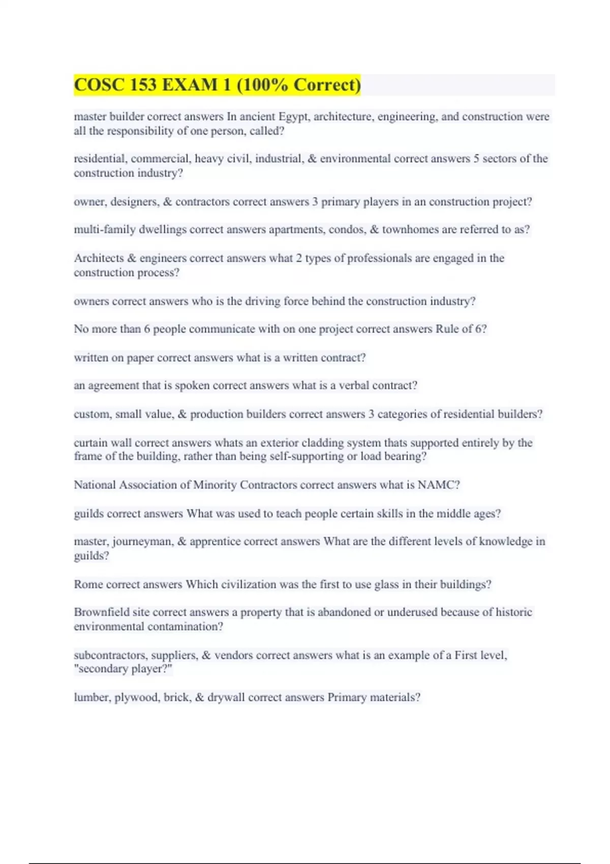COSC 153 EXAM 1 (100% Correct). master builder correct answers In ancient Egypt, architecture, engineering, and construction were all the responsibility of one person, called? residential, commercial, heavy civil, industrial, & environmental correct answers 5 sectors of the construction industry? owner, designers, & contractors correct answers 3 primary players in an construction project? multi-family dwellings correct answers apartments, condos, & townhomes are referred to as? Architects & engineers correct answers what 2 types of professionals are engaged in the construction process? owners correct answers who is the driving force behind the construction industry? No more than 6 people communicate with on one project correct answers Rule of 6? written on paper correct answers what is a written contract? an agreement that is spoken correct answers what is a verbal contract? custom, small value, & production builders correct answers 3 categories of residential builders? curtain wall correct answers whats an exterior cladding system thats supported entirely by the frame of the building, rather than being self-supporting or load bearing? National Association of Minority Contractors correct answers what is NAMC? guilds correct answers What was used to teach people certain skills in the middle ages? master, journeyman, & apprentice correct answers What are the different levels of knowledge in guilds? Rome correct answers Which civilization was the first to use glass in their buildings? Brownfield site correct answers a property that is abandoned or underused because of historic environmental contamination? subcontractors, suppliers, & vendors correct answers what is an example of a First level, "secondary player?" lumber, plywood, brick, & drywall correct answers Primary materials?