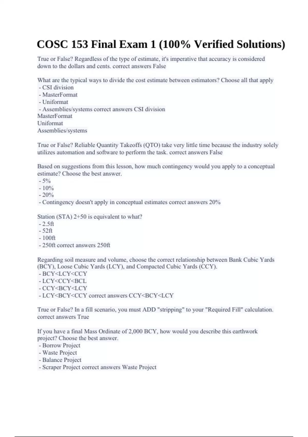 COSC 153 Final Exam 1 (100% Verified Solutions). True or False? Regardless of the type of estimate, it's imperative that accuracy is considered down to the dollars and cents. correct answers False What are the typical ways to divide the cost estimate between estimators? Choose all that apply - CSI division - MasterFormat - Uniformat - Assemblies/systems correct answers CSI division MasterFormat Uniformat Assemblies/systems True or False? Reliable Quantity Takeoffs (QTO) take very little time because the industry solely utilizes automation and software to perform the task. correct answers False Based on suggestions from this lesson, how much contingency would you apply to a conceptual estimate? Choose the best answer. - 5% - 10% - 20% - Contingency doesn't apply in conceptual estimates correct answers 20% Station (STA) 2+50 is equivalent to what? - 2.5ft - 52ft - 100ft - 250ft correct answers 250ft Regarding soil measure and volume, choose the correct relationship between Bank Cubic Yards (BCY), Loose Cubic Yards (LCY), and Compacted Cubic Yards (CCY). - BCY<LCY<CCY - LCY<CCY<BCL - CCY<BCY<LCY - LCY<BCY<CCY correct answers CCY<BCY<LCY True or False? In a fill scenario, you must ADD "stripping" to your "Required Fill" calculation. correct answers True If you have a final Mass Ordinate of 2,000 BCY, how would you describe this earthwork project? Choose the best answer. - Borrow Project - Waste Project - Balance Project - Scraper Project correct answers Waste Project COSC 153 Final Exam 1 (100% Verified Solutions) True or False? Given the complexity of our projects, it is critical to use 3D modeling software to create our Site Logistics Plans correct answers False What are typical items to include on a Site Logistics Plan? Choose all that apply. - Parking - Design details - Access and egress routes - Laydown and staging areas correct answers Parking Access and egress routes Laydown and staging areas .
