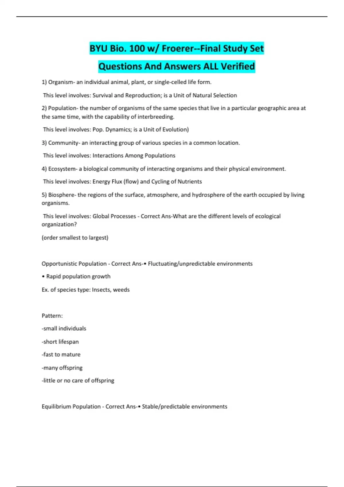 BYU Bio. 100 w/ Froerer--Final Study Set Questions And Answers ALL Verified 1) Organism- an individual animal, plant, or single-celled life form. This level involves: Survival and Reproduction; is a Unit of Natural Selection 2) Population- the number of organisms of the same species that live in a particular geographic area at the same time, with the capability of interbreeding. This level involves: Pop. Dynamics; is a Unit of Evolution) 3) Community- an interacting group of various species in a common location. This level involves: Interactions Among Populations 4) Ecosystem- a biological community of interacting organisms and their physical environment. This level involves: Energy Flux (flow) and Cycling of Nutrients 5) Biosphere- the regions of the surface, atmosphere, and hydrosphere of the earth occupied by living organisms. This level involves: Global Processes - Correct Ans-What are the different levels of ecological organization? (order smallest to largest) Opportunistic Population - Correct Ans-• Fluctuating/unpredictable environments • Rapid population growth Ex. of species type: Insects, weeds Pattern: -small individuals -short lifespan -fast to mature -many offspring -little or no care of offspring Equilibrium Population - Correct Ans-• Stable/predictable environments • Population numbers prescribed by a carrying capacity • Phenotypes best suited to environment (good competitors) Ex. of species type: Large mammals, long lived plants Pattern: -large individuals -long lifespan -slow to mature -few and large offspring -much care of offspring 1) Restricted Geographic Range 2) Narrow Habitat Tolerance 3) Small Local Populations - Correct Ans-What are the three variables taken into account to determine the degree of vulnerability for an equilibrium species? CONTINUES...