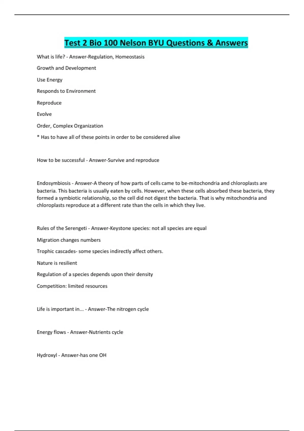 Test 2 Bio 100 Nelson BYU Questions & Answers What is life? - Answer-Regulation, Homeostasis Growth and Development Use Energy Responds to Environment Reproduce Evolve Order, Complex Organization * Has to have all of these points in order to be considered alive How to be successful - Answer-Survive and reproduce Endosymbiosis - Answer-A theory of how parts of cells came to be-mitochondria and chloroplasts are bacteria. This bacteria is usually eaten by cells. However, when these cells absorbed these bacteria, they formed a symbiotic relationship, so the cell did not digest the bacteria. That is why mitochondria and chloroplasts reproduce at a different rate than the cells in which they live. Rules of the Serengeti - Answer-Keystone species: not all species are equal Migration changes numbers Trophic cascades- some species indirectly affect others. Nature is resilient Regulation of a species depends upon their density Competition: limited resources Life is important in... - Answer-The nitrogen cycle Energy flows - Answer-Nutrients cycle Hydroxyl - Answer-has one OH Amino - Answer-has N bonded to two H Carbonyl - Answer-has one double bonded O Carboxyl - Answer-has a double bonded O and an OH A Four-Stage Hypothesis for the Origin of Life (Reductionist Model) - Answer-Synthesis of Organic (contain carbon) Compounds - Amino acids and nucleotides Abiotic Synthesis of Polymers- Proteins and nucleic acids Formation of Pre-Cells- Membrane Origin of Self Replicating Molecules- DNA and RNA Common elements in living things- C.H.O.N.P.S - Answer-Carbon...