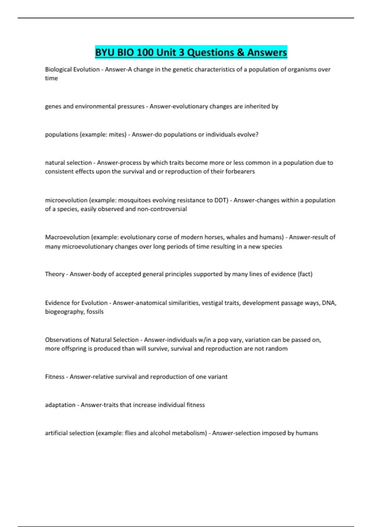 BYU BIO 100 Unit 3 Questions & Answers Biological Evolution - Answer-A change in the genetic characteristics of a population of organisms over time genes and environmental pressures - Answer-evolutionary changes are inherited by populations (example: mites) - Answer-do populations or individuals evolve? natural selection - Answer-process by which traits become more or less common in a population due to consistent effects upon the survival and or reproduction of their forbearers microevolution (example: mosquitoes evolving resistance to DDT) - Answer-changes within a population of a species, easily observed and non-controversial Macroevolution (example: evolutionary corse of modern horses, whales and humans) - Answer-result of many microevolutionary changes over long periods of time resulting in a new species Theory - Answer-body of accepted general principles supported by many lines of evidence (fact) Evidence for Evolution - Answer-anatomical similarities, vestigal traits, development passage ways, DNA, biogeography, fossils Observations of Natural Selection - Answer-individuals w/in a pop vary, variation can be passed on, more offspring is produced than will survive, survival and reproduction are not random Fitness - Answer-relative survival and reproduction of one variant adaptation - Answer-traits that increase individual fitness artificial selection (example: flies and alcohol metabolism) - Answer-selection imposed by humans diversifying selection - Answer-s CONTINUES...