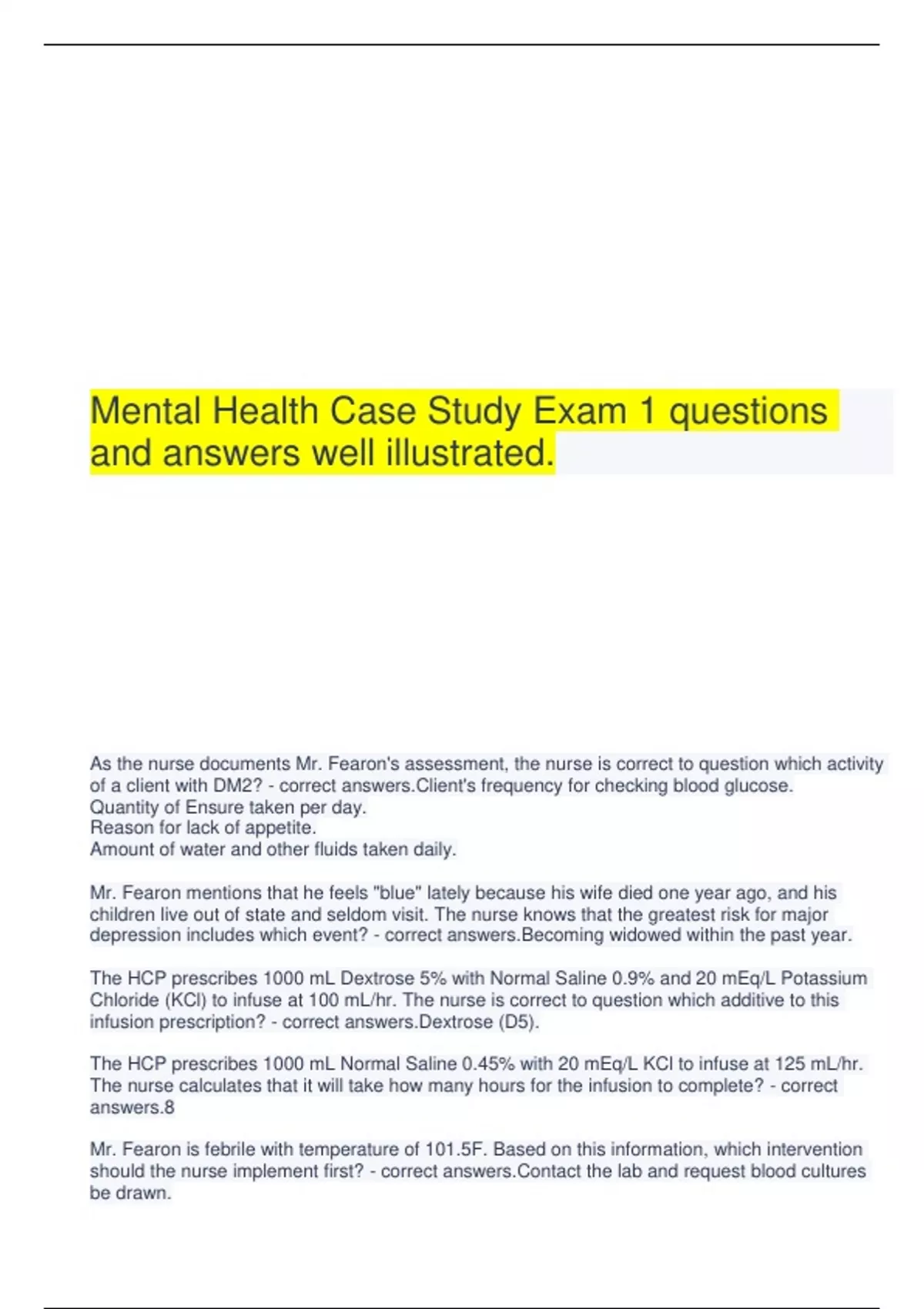 Mental Health Case Study Exam 1 questions and answers well illustrated. As the nurse documents Mr. Fearon's assessment, the nurse is correct to question which activity of a client with DM2? - correct answers.Client's frequency for checking blood glucose. Quantity of Ensure taken per day. Reason for lack of appetite. Amount of water and other fluids taken daily. Mr. Fearon mentions that he feels "blue" lately because his wife died one year ago, and his children live out of state and seldom visit. The nurse knows that the greatest risk for major depression includes which event? - correct answers.Becoming widowed within the past year. The HCP prescribes 1000 mL Dextrose 5% with Normal Saline 0.9% and 20 mEq/L Potassium Chloride (KCl) to infuse at 100 mL/hr. The nurse is correct to question which additive to this infusion prescription? - correct answers.Dextrose (D5). The HCP prescribes 1000 mL Normal Saline 0.45% with 20 mEq/L KCl to infuse at 125 mL/hr. The nurse calculates that it will take how many hours for the infusion to complete? - correct answers.8 Mr. Fearon is febrile with temperature of 101.5F. Based on this information, which intervention should the nurse implement first? - correct answers.Contact the lab and request blood cultures be drawn.