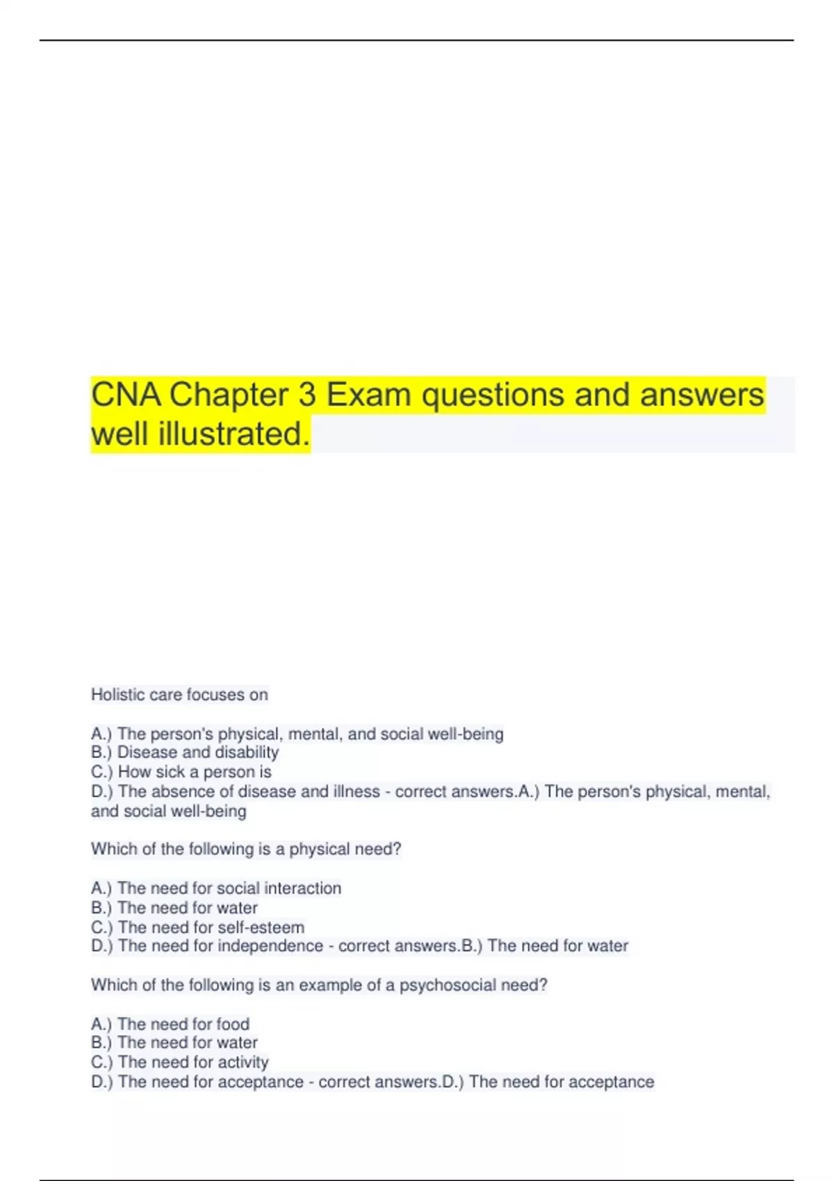 CNA Chapter 3 Exam questions and answers well illustrated. Holistic care focuses on A.) The person's physical, mental, and social well-being B.) Disease and disability C.) How sick a person is D.) The absence of disease and illness - correct answers.A.) The person's physical, mental, and social well-being Which of the following is a physical need? A.) The need for social interaction B.) The need for water C.) The need for self-esteem D.) The need for independence - correct answers.B.) The need for water Which of the following is an example of a psychosocial need? A.) The need for food B.) The need for water C.) The need