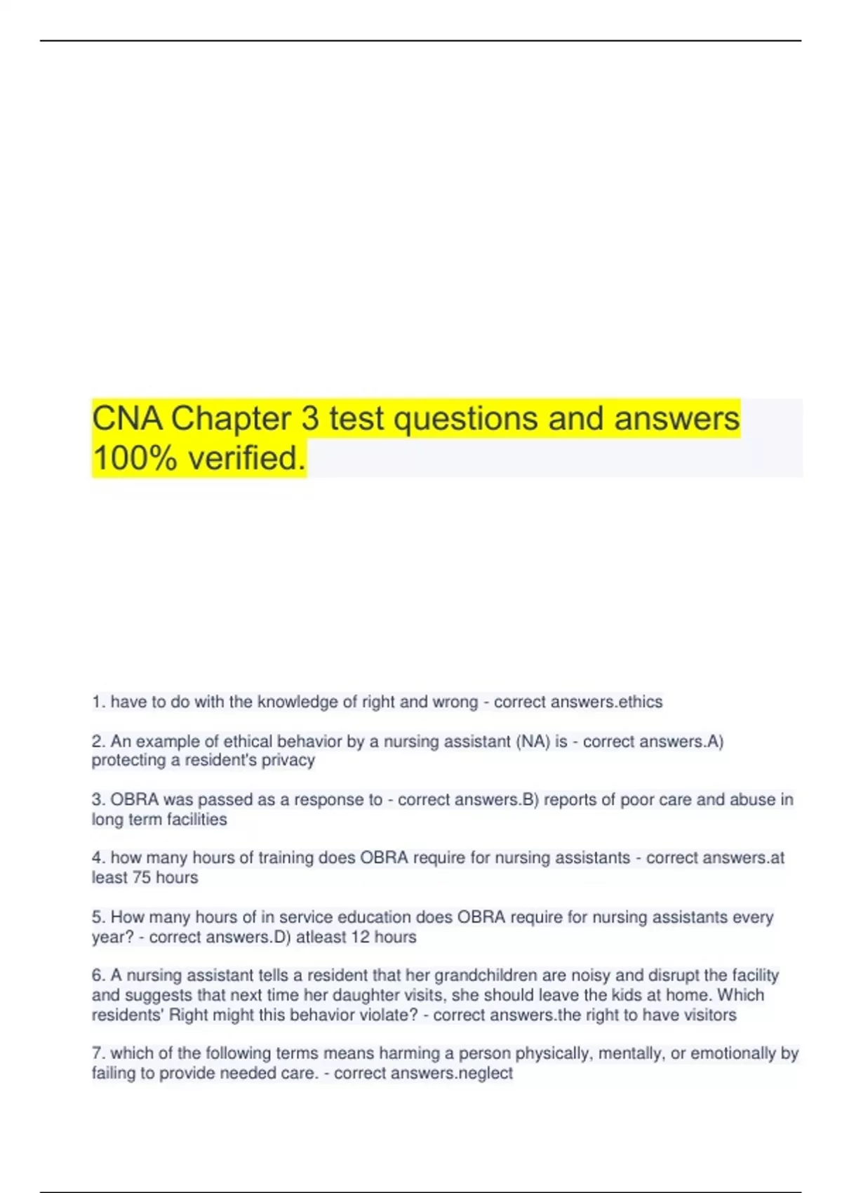 CNA Chapter 3 test questions and answers 100% verified.