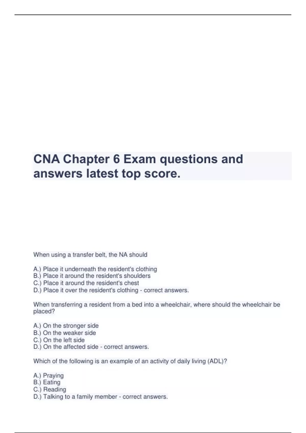 CNA Chapter 6 Exam questions and answers latest top scoreCNA Chapter 6 Exam questions and answers latest top score. When using a transfer belt, the NA should A.) Place it underneath the resident's clothing B.) Place it around the resident's shoulders C.) Place it around the resident's chest D.) Place it over the resident's clothing - correct answers. When transferring a resident from a bed into a wheelchair, where should the wheelchair be placed? A.) On the stronger side B.) On the weaker side C.) On the