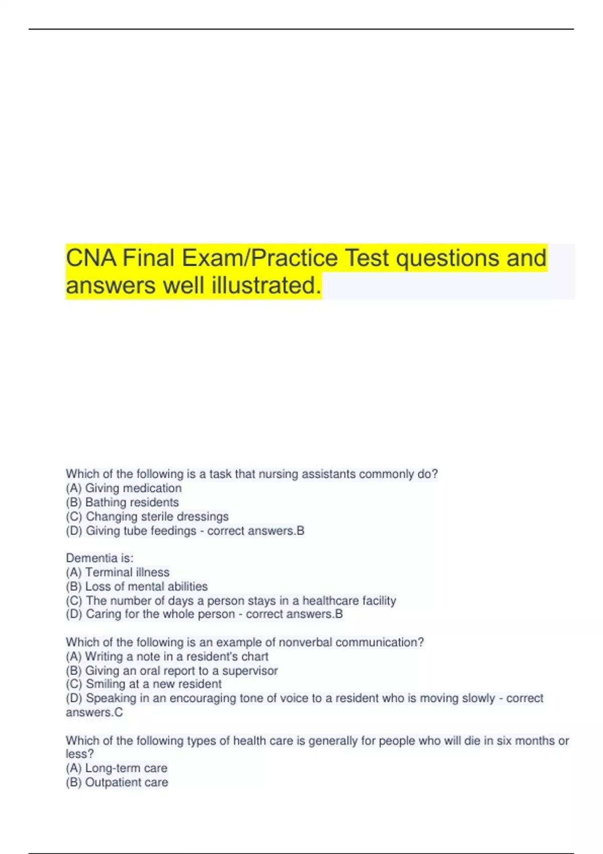 CNA Final Exam/Practice Test questions and answers well illustrated. Which of the following is a task that nursing assistants commonly do? (A) Giving medication (B) Bathing residents (C) Changing sterile dressings (D) Giving tube feedings - correct answers.B Dementia is: (A) Terminal illness (B) Loss of mental abilities (C) The number of days a person stays in a healthcare facility (D) Caring for the whole person - correct answers.B Which of the following is an example of nonverbal communication? (A) Writing a note in a resident's chart (B) Giving an oral report to a supervisor (C) Smiling at a new resident (D) Speaking in an encouraging tone of voice to a resident who is moving slowly - correct answers.C Which of the following types of health care is generally for people who will die in six months or less? (A) Long-term care (B) Outpatient care (C) Inter-generatio