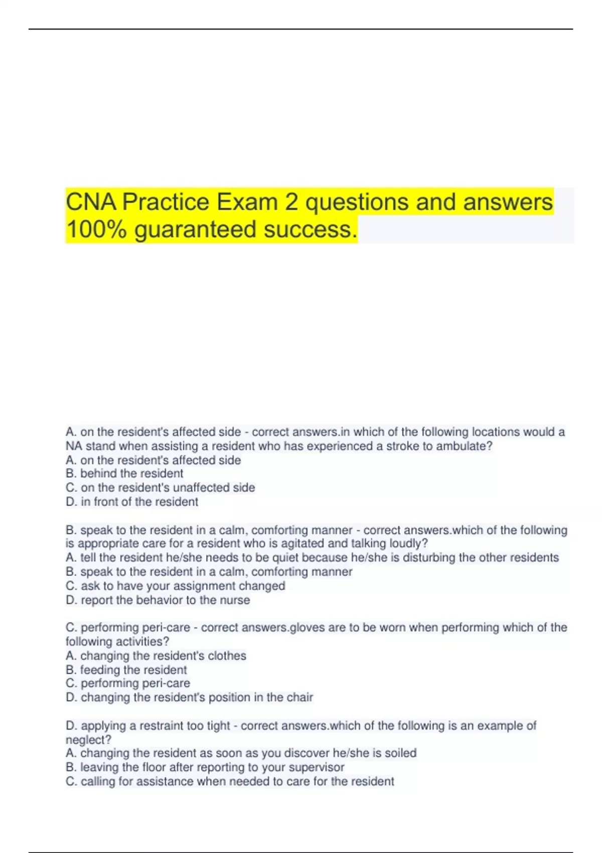 CNA Practice Exam 2 questions and answers 100% guaranteed success. A. on the resident's affected side - correct which of the following locations would a NA stand when assisting a resident who has experienced a stroke to ambulate? A. on the resident's affected side B. behind the resident C. on the resident's unaffected side D. in front of the resident B. speak to the resident in a calm, comforting manner - correct of the following is appropriate care for a resident who is agitated and talking loudly? A. tell the resident he/she needs to be quiet because he/she is disturbing the other residents B. speak to the resident in a calm, comforting manner C. ask to have your assignment changed D. report the behavior to the nurse C. performing peri-care - correct s are to be worn when performing which of the following activities? A. changing the resident's clothes B. feeding the resident C. performing peri-care D. changing the resident's position in the chair D. applying a restraint to