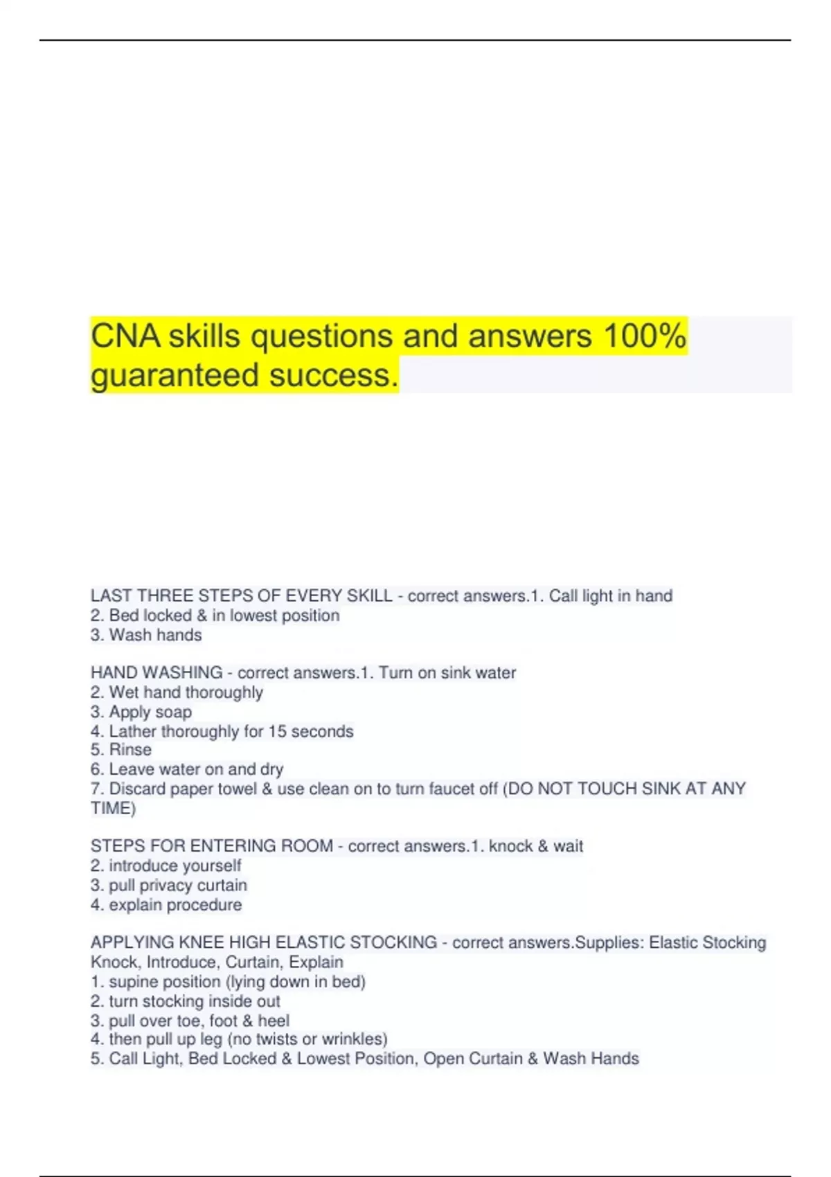 CNA skills questions and answers 100% guaranteed success. LAST THREE STEPS OF EVERY SKILL - correct answers.1. Call light in hand 2. Bed locked & in lowest position 3. Wash hands HAND WASHING - correct answers.1. Turn on sink water 2. Wet hand thoroughly 3. Apply soap 4. Lather thoroughly for 15 seconds 5. Rinse 6. Leave water on and dry 7. Discard paper towel & use clean on to turn faucet off (DO NOT TOUCH SINK AT ANY TIME) STEPS FOR ENTERING ROOM - correct answers.1. knock & wait 2. introduce yourself 3. pull privacy curtain 4. explain procedure APPLYING KNEE HIGH ELASTIC STOCKING - correct answers.Supplies: Elastic Stocking Knock, Introduce, Curtain, Explain 1. supine position (lying down in bed) 2. turn stocking inside out 3. pull over toe, foot & heel 4. then pull up leg (no twists or wrinkles) 5. Call Lig