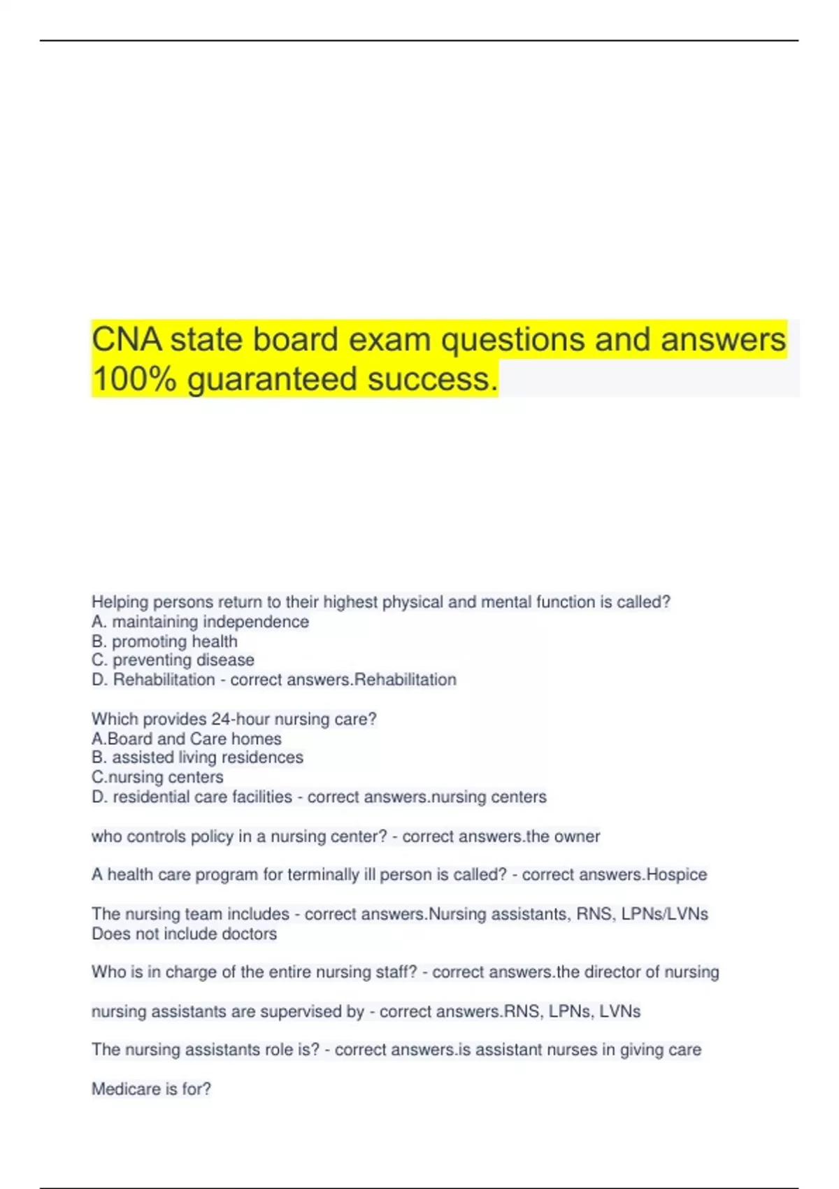 CNA state board exam questions and answers 100% guaranteed success. Helping persons return to their highest physical and mental function is called? A. maintaining independence B. promoting health C. preventing disease D. Rehabilitation - correct answers.Rehabilitation Which provides 24-hour nursing care? A.Board and Care homes B. assisted living residences C.nursing centers D. residential care facilities - correct ng centers who controls policy in a nursing center? - correct owner A health care program for terminally ill person is called? - correct answers.Hospice The nursing team includes - correct answers.Nursing assistants, RNS, LPNs/LVNs Does not include doctors Who is in charge of the entire nursing staff? - correct director of nursing nursing assistants are supervised by - correct answers.RNS, LPNs, LVNs The nursing assistants role is? - correct assistant nurses in giving care Medicare is for? Medicaid is for? - correct ns over the age of 65/ the disabled A survey team is at your center. A team member asked you some questions. you should - correct r them completely and honestly What state law affects w