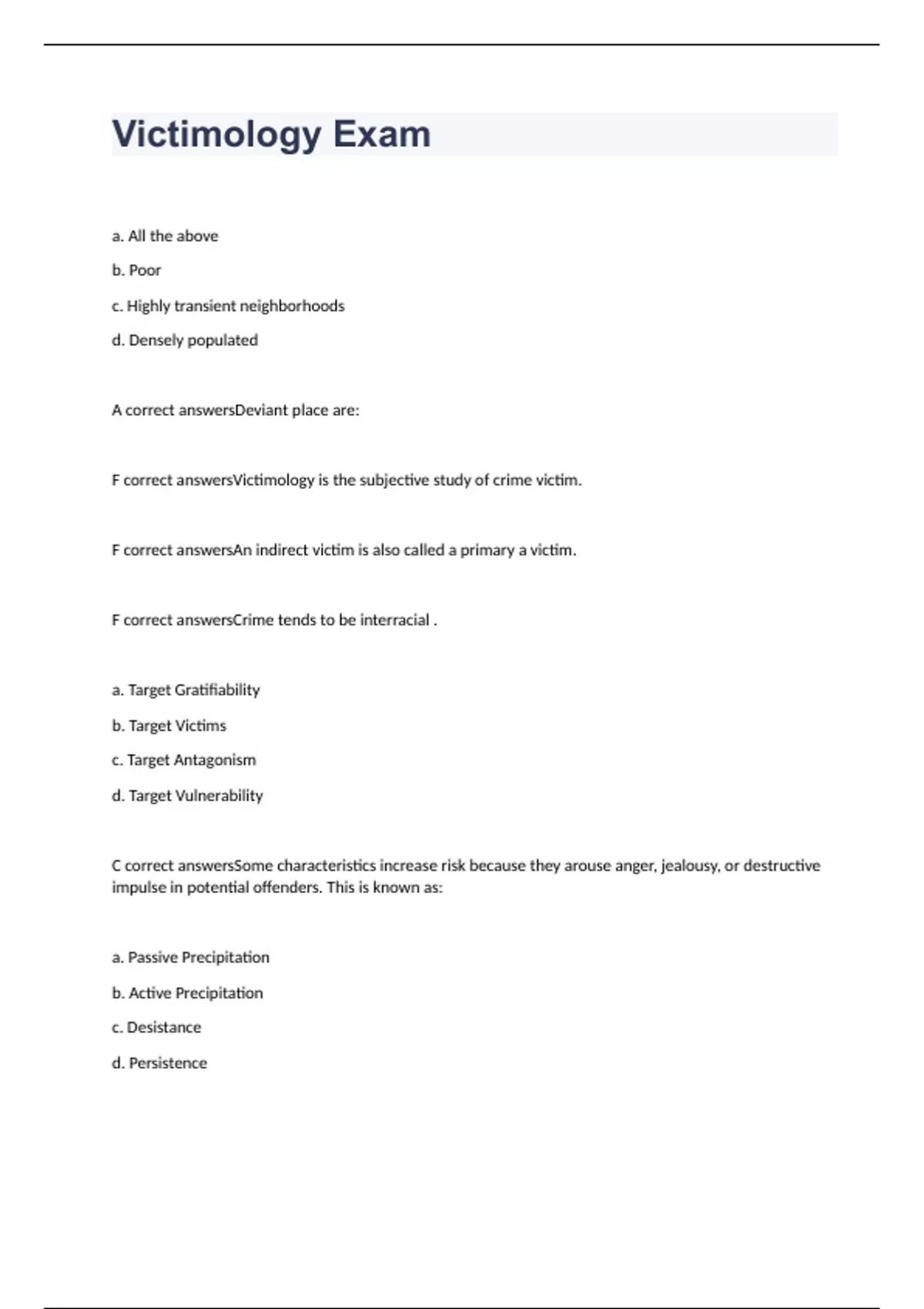 a. All the above b. Poor c. Highly transient neighborhoods d. Densely populated A correct answersDeviant place are: F correct answersVictimology is the subjective study of crime victim. F correct answersAn indirect victim is also called a primary a victim. F correct answersCrime tends to be interracial . a. Target Gratifiability b. Target Victims c. Target Antagonism d. Target Vulnerability C correct answersSome characteristics increase risk because they arouse anger, jealousy, or destructive impulse in potential offenders. This is known as: a. Passive Precipitation b. Active Precipitation c. Desistance d. Persistence