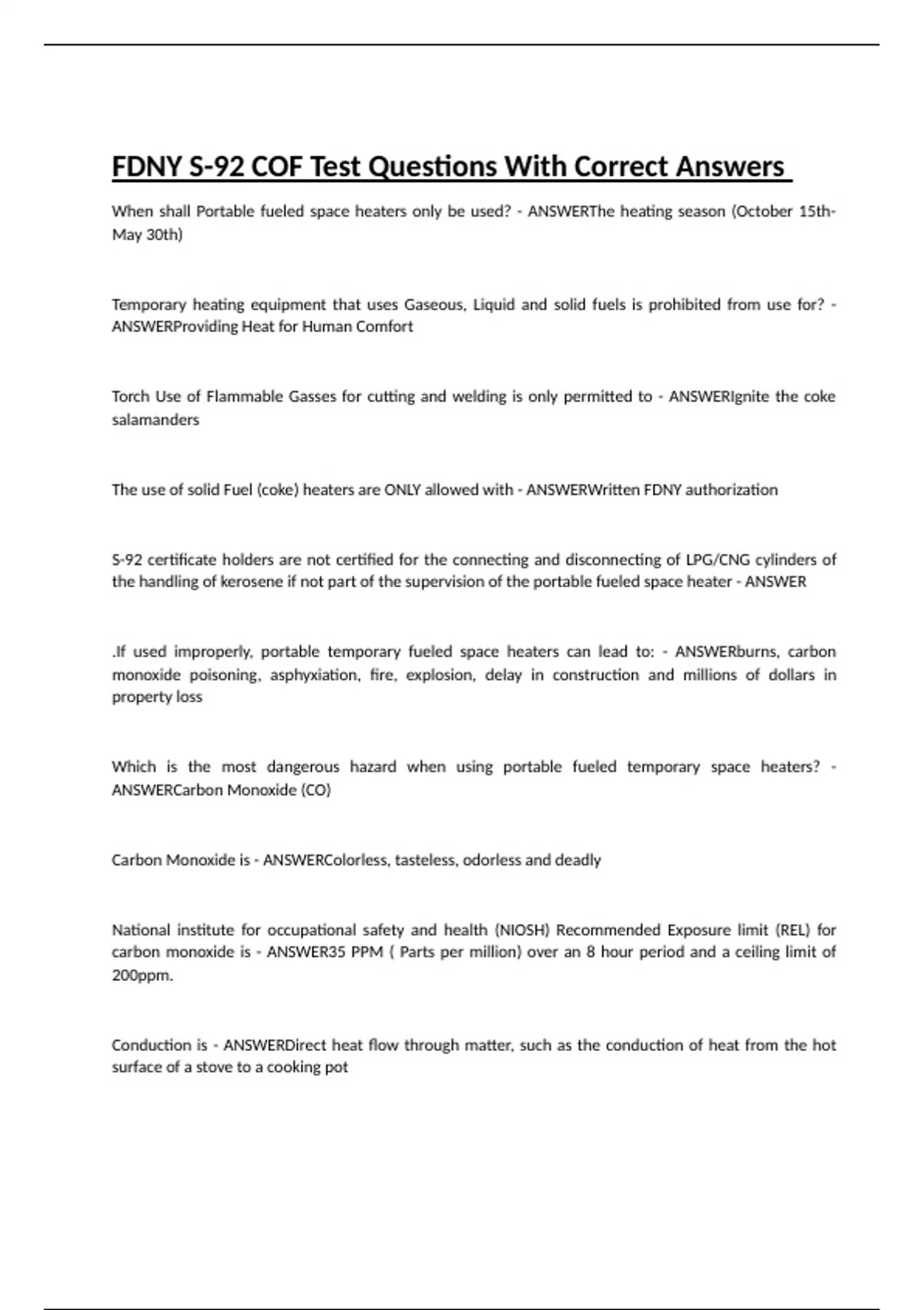 When shall Portable fueled space heaters only be used? - ANSWERThe heating season (October 15th- May 30th) Temporary heating equipment that uses Gaseous, Liquid and solid fuels is prohibited from use for? - ANSWERProviding Heat for Human Comfort Torch Use of Flammable Gasses for cutting and welding is only permitted to - ANSWERIgnite the coke salamanders The use of solid Fuel (coke) heaters are ONLY allowed with - ANSWERWritten FDNY authorization S-92 certificate holders are not certified for the connecting and disconnecting of LPG/CNG cylinders of the handling of kerosene if not part of the supervision of the portable fueled space heater - ANSWER .If used improperly, portable temporary fueled space heaters can lead to: - ANSWERburns, carbon monoxide poisoning, asphyxiation, fire, explosion, delay in construction and millions of dollars in property loss Which is the most dangerous hazard when using portable fueled temporary space heaters? - ANSWERCarbon Monoxide (CO)