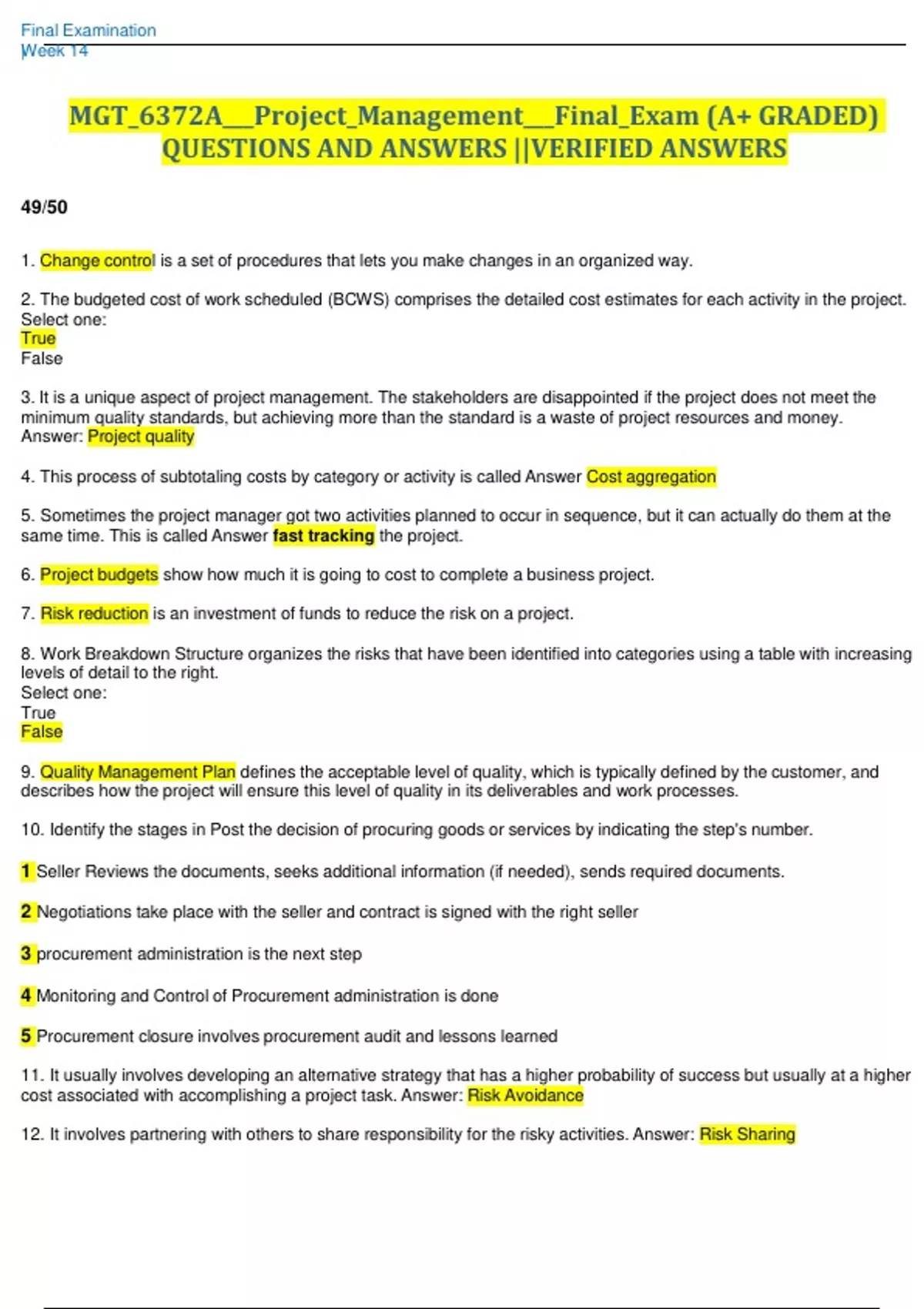 MGT_6372A___Project_Management___Final_Exam (A+ GRADED) QUESTIONS AND ANSWERS ||VERIFIED ANSWERSMGT_6372A___Project_Management___Final_Exam (A+ GRADED) QUESTIONS AND ANSWERS ||VERIFIED ANSWERS||THIS IS FINAL!!