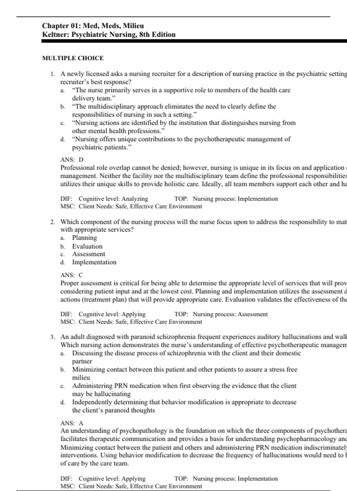 1. A newly licensed asks a nursing recruiter for a description of nursing practice in the psychiatric setting