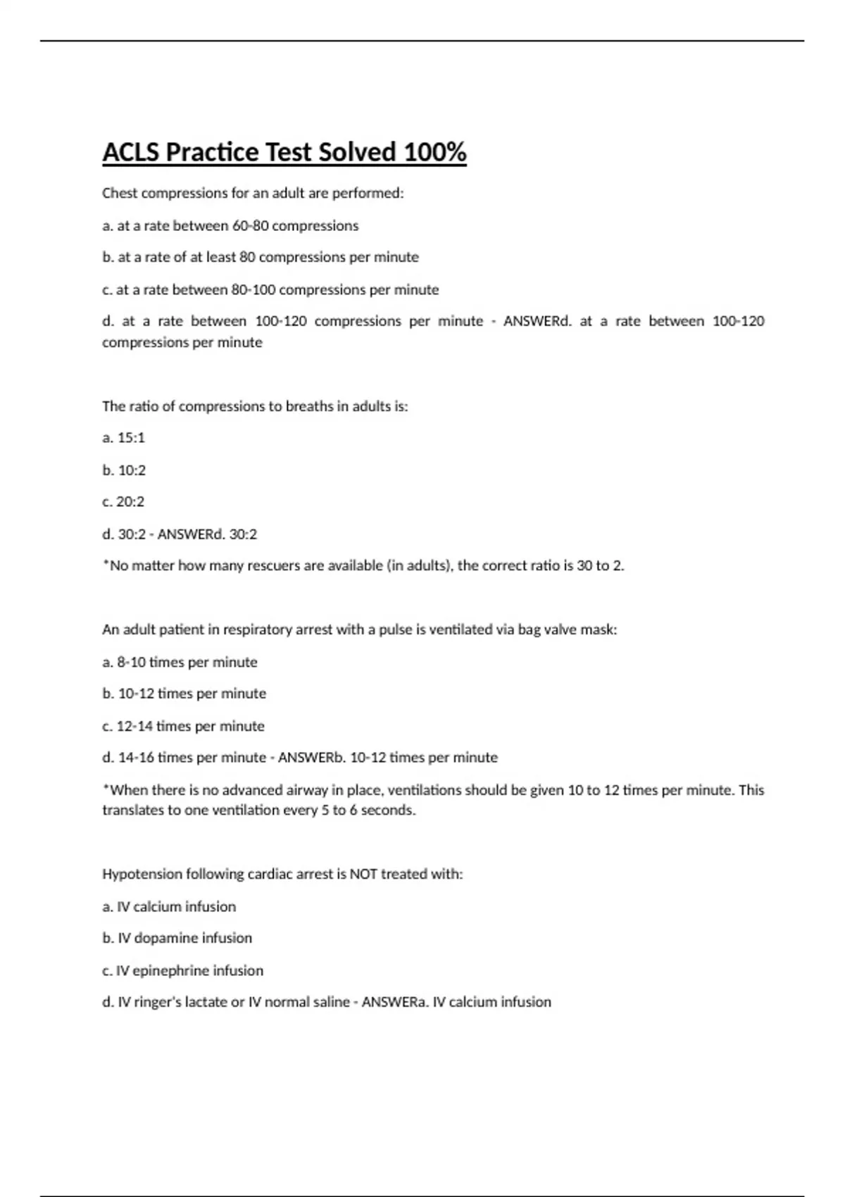 Chest compressions for an adult are performed: a. at a rate between 60-80 compressions b. at a rate of at least 80 compressions per minute c. at a rate between 80-100 compressions per minute d. at a rate between 100-120 compressions per minute - ANSWERd. at a rate between 100-120 compressions per minute The ratio of compressions to breaths in adults is: a. 15:1 b. 10:2 c. 20:2 d. 30:2 - ANSWERd. 30:2 *No matter how many rescuers are available (in adults), the correct ratio is 30 to 2. An adult patient in respiratory arrest with a pulse is ventilated via bag valve mask: a. 8-10 times per minute b. 10-12 times per minute c. 12-14 times per minute d. 14-16 times per minute - ANSWERb. 10-12 times per minute *When there is no advanced airway in place, ventilations should be given 10 to 12 times per minute. This translates to one ventilation every 5 to 6 seconds. Hypotension following cardiac arrest is NOT treated with: a. IV calcium infusion b. IV dopamine infusion c. IV epinephrine infusion d. IV ringer's lactate or IV normal saline - ANSWERa. IV calcium infusion *Fluid resuscitation and/or "pressors" like epinephrine and dopamine are used to maintain blood pressure after cardiac arrest. Hypocalcemia, if present, can be treated separately but this is not a standard treatment for hypotension. The leader in team resuscitation must: a. be able to perform all the skills if needed b. be certified as a leader c. be a physician d. undergo leadership training - ANSWERa. be able to perform all the skills if needed *There is no special training required to be a team leader other than the ability to perform all facets of the resuscitation, if needed. While the team leader is often a physician, this is not essential as long as a team member is capable of prescribing ACLS medications. Recommended ED door to balloon inflation time for a STEMI patient is: a. no longer than 15 minutes b. no longer than 30 minutes c. no longer than 60 minutes d. no longer than 90 minutes - ANSWERd. no longer than 90 minutes *Programs should be set up to have STEMI patients diagnosed, evaluated, and treated within 90 minutes of arriving to the emergency department The effectiveness of CPR can be estimated by: a. arterial diastolic blood pressure b. quantitative waveform capnography c. central venous oxygen saturation d. all of the above - ANSWERd. all of the above *All of these measures can inform providers about the quality of CPR. The quantitative waveform capnography goal is at least 10 mm Hg during CPR. Arterial diastolic blood pressure should be at least 20 mm Hg during CPR. Central venous oxygen saturation as measured by a Swan-Ganz catheter or equivalent should be at least 30%. Narrow-complex supra ventricular tachycardia is best treated with: