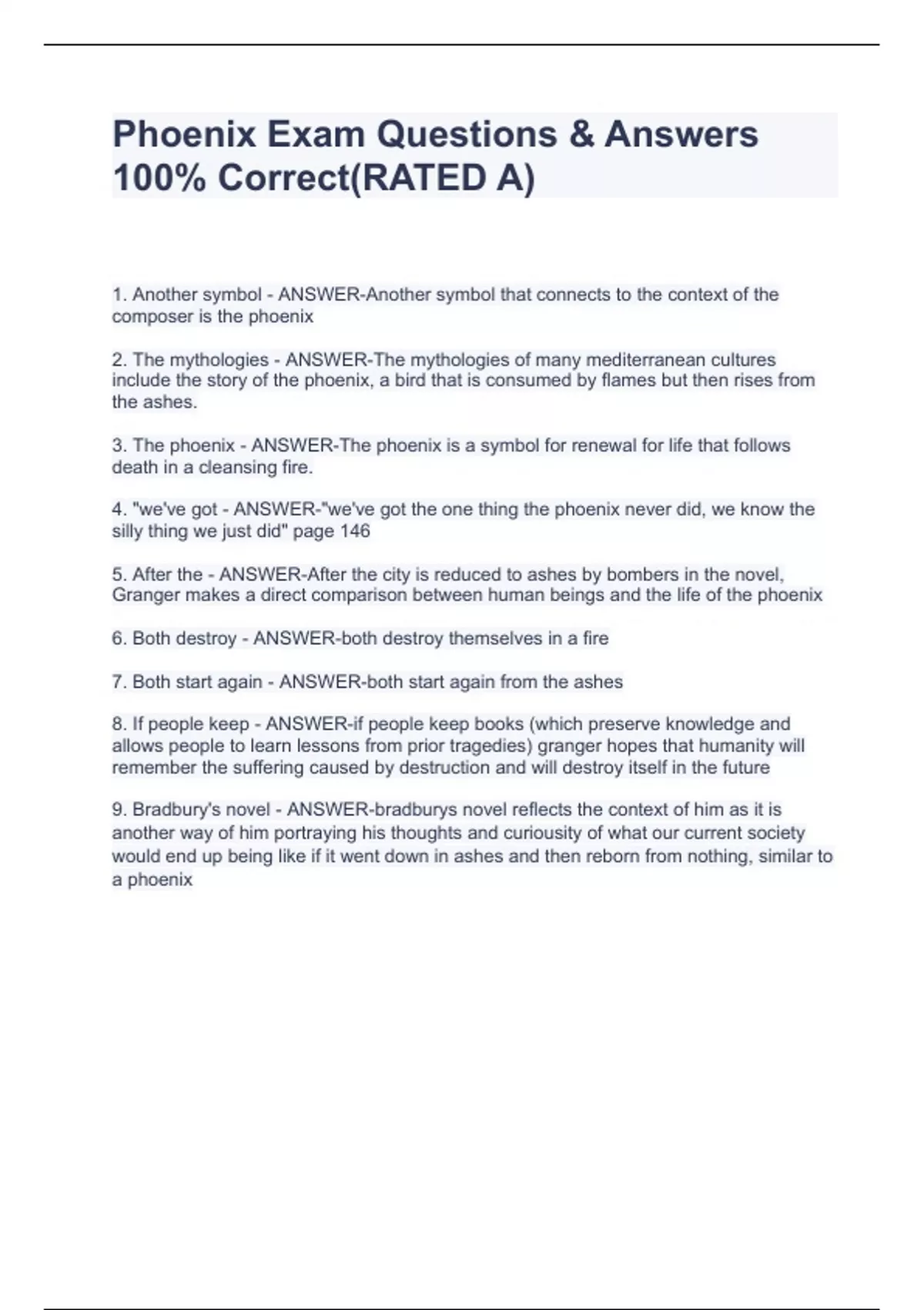 1. Another symbol - ANSWER-Another symbol that connects to the context of the composer is the phoenix 2. The mythologies - ANSWER-The mythologies of many mediterranean cultures include the story of the phoenix, a bird that is consumed by flames but then rises from the ashes. 3. The phoenix - ANSWER-The phoenix is a symbol for renewal for life that follows death in a cleansing fire. 4. "we've got - ANSWER-"we've got the one thing the phoenix never did, we know the silly thing we just did" page 146 5. After the - ANSWER-After the city is reduced to ashes by bombers in the novel, Granger makes a direct comparison between human beings and the life of the phoenix 6. Both destroy - ANSWER-both destroy themselves in a fire 7. Both start again - ANSWER-both start again from the ashes 8. If people keep - ANSWER-if people keep books (which preserve knowledge and allows people to learn lessons from prior tragedies) granger hopes that humanity will remember the suffering caused by destruction and will destroy itself in the future 9. Bradbury's novel - ANSWER-bradburys novel reflects the context of him as it is another way of him portraying his thoughts and curiousity of what our current society would end up being like if it went down in ashes and then reborn from nothing, similar to a phoenix