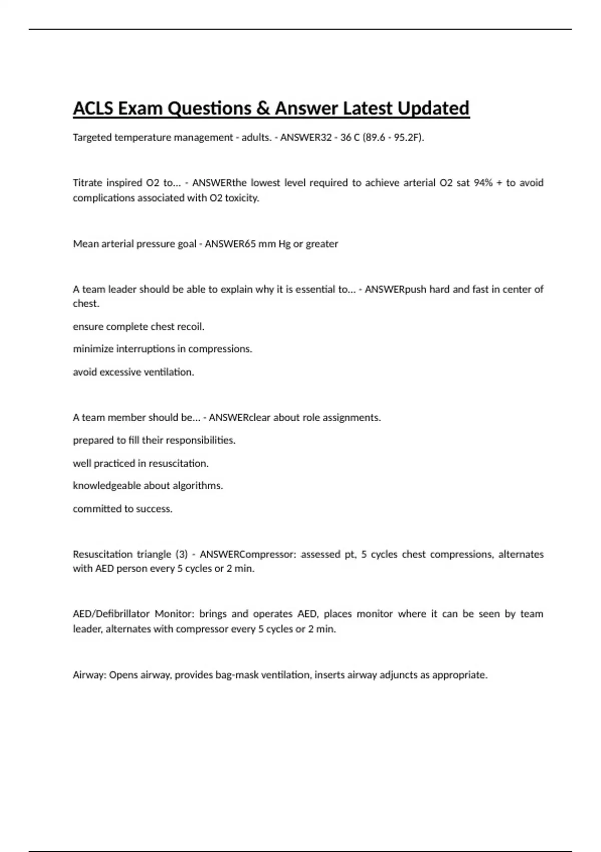 Targeted temperature management - adults. - ANSWER32 - 36 C (89.6 - 95.2F). Titrate inspired O2 to... - ANSWERthe lowest level required to achieve arterial O2 sat 94% + to avoid complications associated with O2 toxicity. Mean arterial pressure goal - ANSWER65 mm Hg or greater A team leader should be able to explain why it is essential to... - ANSWERpush hard and fast in center of chest. ensure complete chest recoil. minimize interruptions in compressions. avoid excessive ventilation. A team member should be... - ANSWERclear about role assignments. prepared to fill their responsibilities. well practiced in resuscitation. knowledgeable about algorithms. committed to success. Resuscitation triangle (3) - ANSWERCompressor: assessed pt, 5 cycles chest compressions, alternates with AED person every 5 cycles or 2 min. AED/Defibrillator Monitor: brings and operates AED, places monitor where it can be seen by team leader, alternates with compressor every 5 cycles or 2 min. Airway: Opens airway, provides bag-mask ventilation, inserts airway adjuncts as appropriate. Leadership roles (3) - ANSWERTeam leader: every team needs one. assigns roles to team members, makes treatment decisions, provides feedback, assumes responsibility for roles not assigned. Meds: Initiates IV/IO access, administers meds. Time recorder: records time of interventions & medications and announces when next are due, records frequency and duration of interruptions in compressions, communicates to the team leader. Should you start CPR when you are unsure about a pulse? - ANSWERYes, unnecessary compressions are less harmful than failing to provide compressions when needed. Agonal gasps - ANSWERA sign of cardiac arrest! May be present in first minutes. Looks like pt is drawing in air quickly. Occur at a slow rate. May be forceful or weak. Time passes between gasps. Snort, snore, groan. BLS assessment - ANSWERCheck responsiveness. Shout for help. Get AED/send someone. Look for breathing - chest 5-10 sec. Check pulse at same time. 5-10 sec. No pulse in 10 sec, start chest compressions. If pulse, rescue breathing 1 breath q 5-6 sec. Check pulse q 2 minutes. Defibrillation: check for shockable rhythm, shock, follow with compressions. Minimize interruptions - ANSWERNo longer than 10 sec! Avoid... prolonged rhythm analysis. frequent/inappropriate pulse checks. taking too long to give breaths. unnecessary moving the pt. Coronary Perfusion Pressure (CPP) - ANSWERAortic relaxation (diastolic) - right atrial relaxation (diastolic) pressure. Correlates with both myocardial blood flow and return of spontaneous circulation. ROSC does not occur unless it is 15 mm Hg or + If < 20 improve chest compressions and vasopressor therapy. Quality compressions - ANSWERcompress 2 in (5 cm). Rate 100-120 BPM. Allow complete recoil. single rescuer CPR - ANSWERCardiac arrest: Call for help, get AED, return to pt, start CPR. Hypoxia (drowning): give 2 mins CPR before activating emergency response system. Primary Assessment - ANSWERAssess before action!!! Airway, Breathing, Circulation, Disability (Alert, Voice, Painful, Unresponsive), Exposure (remove clothing to examine). Secondary Assessment - ANSWERFocused medical history and physical exam. SAMPLE Signs and sx. Allergies. Medications (including last dose taken). Past medical hx. Last meal consumed. Events. H&Ts - ANSWERCommon reversible causes of cardiac arrest. Hypovolemia, hypoxia, hydrogen ion (acidosis), Hypo/hyperkalemia, hypothermia. Tension pneumo, tamponade (cardiac), toxins, thrombosis (coronary or pulmonary). 2 most common causes of PEA - ANSWERHypoxia and hypovolemia. PEA hypovolemia - ANSWERrapid, narrow-complex tachycardia (sinus tachy). Increased diastolic, decreased systolic pressure. BP drops. Narrow QRS. Common causes: occult internal hemorrhage, severe dehydration. Consider volume infusion. acute coronary syndrome - ANSWERsudden symptoms of insufficient blood supply to the heart indicating unstable angina or acute myocardial infarction Tx for PE - ANSWERFibrinolytics. Tx for cardiac tamponade - ANSWERpericardiocentesis. tx for Tension pneumo - ANSWERneedle aspiration and chest tube placement. Drug overdose/toxic exposure - ANSWERmay lead to peripheral vascular dilation and/or myocardial dysfunction with hypotension. Tx: prolonged basic CPR, etracorporeal CPR, intra-aortic balloon pumping, renal dialysis, IV lipid emulsion, digoxin, glucagon, bicarbonate, transcutaneous pacing, correction of electrolyte imbalances. Normal respiratory rate. Normal tidal volume. - ANSWER12-16/min. 8-10 ml/kg. ***<6 = assisted ventilation with BVM or advanced airway with 100% O2. Respiratory Distress - ANSWERabnormal respiratory rate or effort. Sx: nasal flaring, retractions, use of accessory muscles, hypoventilation, bradypnea, stridor, wheezing, grunting, tachycardia, cyanosis, changes in LOC, agitation, use of abdominal muscles. Mild respiratory distress sx - ANSWERmild tachypnea and mild increase in respiratory effort with changes in airway sounds. Severe respiratory distress sx - ANSWERtachypnea, increased respiratory effort, deterioration in skin color, changes in mental status. Can be indicitive of respiratory failure. Respiratory Failure - ANSWERinadequate oxygenation, ventilation or both. Often the end stage of respiratory distress. Confirm dx with objective measures (pulseOx, ABGs). Sx of respiratory failure - ANSWERmarked tachypnea, bradypnea, apnea (late), increased/decreased/no effort, poor/absent distal air movement, tachycardia (early), bradycardia (late), cyanosis, stupor, coma (late). Causes of respiratory failure - ANSWERupper or lower airway obstruction. Lung tissue disease. Disordered control of breathing. Rise in arterial CO2 (hypercapnia). Drop in blood O2. Respiratory arrest - ANSWERthe cessation of breathing. Caused by drowning or head injury. Tx: tidal volume 500-600ml (visable chest rise). ***Pts with airway obstruction or poor lung compliance may require higher pressures. Complicati