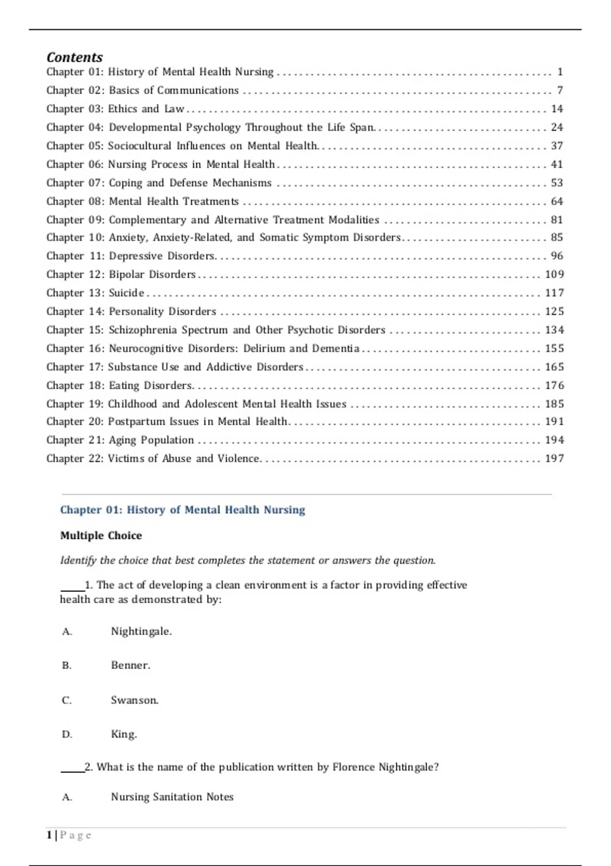 Test Bank Neeb's Mental Health Nursing (5e by Gorman and Anwar) Contents Chapter 01: History of Mental Health Nursing ................................ ................. 1 Chapter 02: Basics of Communications ................................ ....................... 7 Chapter 03: Ethics and Law ................................ ................................ 14 Chapter 04: Developmental Psychology Throughout the Life Span ............................... 24 Chapter 05: Sociocultural Influences on Mental Health ................................ ......... 37 Chapter 06: Nursing Process in Mental Health ................................ ................ 41 Chapter 07: Coping and Defense Mechanisms ................................ ................ 53 Chapter 08: Mental Health Treatments ................................ ...................... 64 Chapter 09: Complementary and Alternative Treatment Modalities ............................. 81 Chapter 10: Anxiety, Anxiety-Related, and Somatic Symptom Disorders .......................... 85 Chapter 11: Depressive Disorders ................................ ........................... 96 Chapter 12: Bipolar Disorders ................................ ............................. 109 Chapter 13: Suicide ................................ ................................ ...... 117 Chapter 14: Personality Disorders ................................ ......................... 125 Chapter 15: Schizophrenia Spectrum and Other Psychotic Disorders ........................... 134 Chapter 16: Neurocognitive Disorders: Delirium and Dementia ................................ 155 Chapter 17: Substance Use and Addictive Disorders ................................ .......... 165 Chapter 18: Eating Disorders ................................ .............................. 176 Chapter 19: Childhood and Adolescent Mental Health Issues ................................ .. 185 Chapter 20: Postpartum Issues in Mental Health ................................ ............. 191 Chapter 21: Aging Population ................................ ............................. 194 Chapter 22: Victims of Abuse and Violence ................................ .................. 197 Chapter 01: History of Mental Health Nursing Multiple Choice Identify the choice that best completes the statement or answers the question. 1. The act of developing a clean environment is a factor in providing effective health care as demonstrated by: A. Nightingale. B. C. D. Benner. Swanson. King. 2. What is the name of the publication written by Florence Nightingale? A. 1 | P a g e Nursing Sanitation NotesB. C. D. Nursing 101 Notes on Nursing Nursing Notes 3. A long-term goal for in-patient mental health treatment is generally to: A. B. C. D. Return the patient to the community. Locate a facility for long term care. Be arrested and placed in prison. Be completely cured of the disorder. 4. The mentally ill were once housed in mental institutions known as: A. B. C. D. patient? A. B. C. D. Hospitals. Long-term care facilities. Asylums. Free-standing treatment centers. 5. Which nursing theorists promoted the interpersonal theory between the nurse and the Hildegard Peplau Hattie Bessent Mary Mahoney Linda Richards Completion Complete each statement. 6. Phenothiazines were discovered in what year? . 7. The first psychiatric program of study was established by which nursing leader? 8. Who was the nurse theorist who was the first American-trained nurse credited with teaching how to provide care for people with mental illness? 9. The greatest advance in the early years of mental health care was the introduction of . 2 | P a g e10. The legislation that provided funding for improving the care of the mentally ill is known as the National Mental Health Act of what year? . 11. Which nursing organization established the first certification of psychiatric nursing? 12. One of the goals of the American Nurses Association (ANA) is to promote nursing care in the United States. 13. has always been called the founder of nursing. 14. A schoolteacher by the name of established asylums and a psychiatric hospital for the mentally ill. 15. Special facilities designed to care for the mentally ill in the past were known as 16. The first psychotropic drug category was known as . 17. Each state adopts its own set of rules and guidelines that govern the nurses performance. These rules are known as the Practice Act. 18. The first major federal law to address mental illness was called the Act. Multiple Response Identify one or more choices that best complete the statement or answer the question. 19. What trends contributed to the deinstitutionalization of mental health facilities to outpatient care (select all that apply): A. Cost of the facilities. B. C. D. The increased use of phenothiazines. Staff cost. Establishment of Outpatient clinics. Chapter 1: History of Mental Health Nursing Answer Section MULTIPLE CHOICE 1. ANS: A Florence Nightingales commitments to improved outcomes at a military hospital were directly related to introducing sanitation methods. PTS: 1 KEY: Integrated Processes: Teaching/Learning | Content Area: Community Health | Cognitive Level: Application | Client Need: Safe and Effective Care Environment: Safety and Infection Control 2. ANS: C 3 | P a g e . ofFlorence Nightingale wrote the book Notes on Nursing, which specified the importance of a clean environment. PTS: 1 KEY: Integrated Processes: Teaching/Learning| Content Area: Nursing Trends| Cognitive Level: Knowledge| Client Need: Health Promotion and Maintenance: Health Promotion/Disease Prevention 3. ANS: A To eventually return the patient to the community by creating a good support system and appropriate medication if needed is generally the long-term goal. PTS: 1 KEY: Integrated Processes: Nursing Process: Planning | Content Area: Mental Health | Cognitive Level: Comprehension | Client Need: Safe and Effective Care Environment: Management of Care: Coordinated Care 4. ANS: C