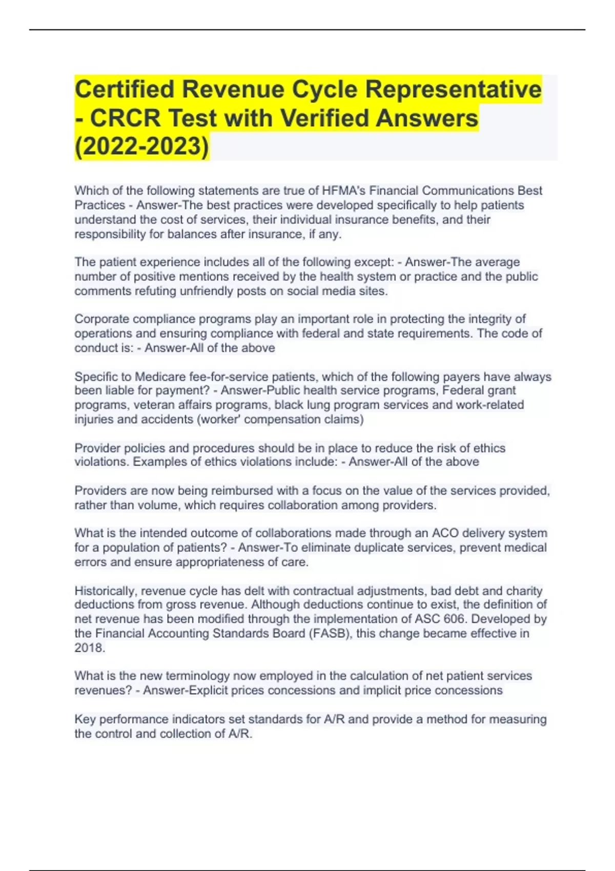 The patient experience includes all of the following except: - Answer-The average number of positive mentions received by the health system or practice and the public comments refuting unfriendly posts on social media sites. Corporate compliance programs play an important role in protecting the integrity of operations and ensuring compliance with federal and state requirements. The code of conduct is: - Answer-All of the above Specific to Medicare fee-for-service patients, which of the following payers have always been liable for payment? - Answer-Public health service programs, Federal grant programs, veteran affairs programs, black lung program services and work-related injuries and accidents (worker' compensation claims) Provider policies and procedures should be in place to reduce the risk of ethics violations. Examples of ethics violations include: - Answer-All of the above Providers are now being reimbursed with a focus on the value of the services provided, rather than volume, which requires collaboration among providers. What is the intended outcome of collaborations made through an ACO delivery system for a population of patients? - Answer-To eliminate duplicate services, prevent medical errors and ensure appropriateness of care. Historically, revenue cycle has delt with contractual adjustments, bad debt and charity deductions from gross revenue. Although deductions continue to exist, the definition of net revenue has been modified through the implementation of ASC 606. Developed by the Financial Accounting Standards Board (FASB), this change became effective in 2018. What is the new terminology now employed in the calculation of net patient services revenues? - Answer-Explicit prices concessions and implicit price concessions Key performance indicators set standards for A/R and provide a method for measuring the control and collection of A/R.