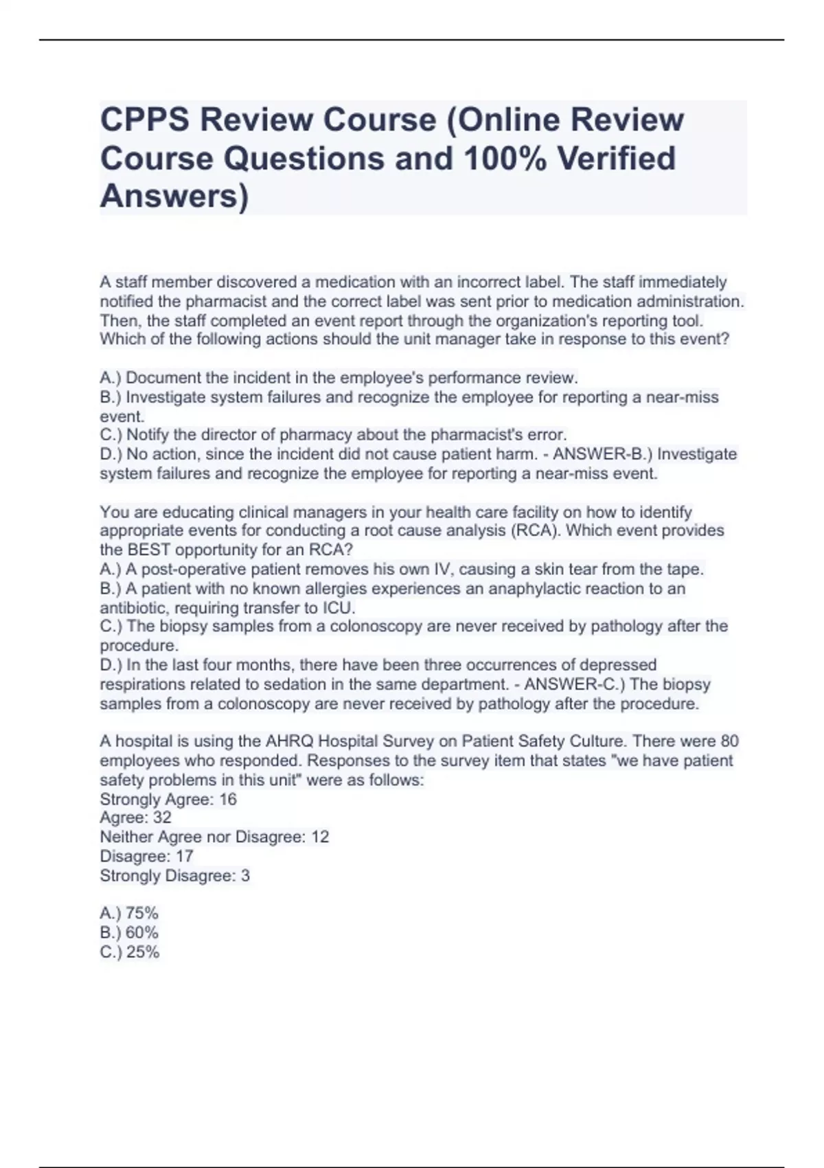 A.) Document the incident in the employee's performance review. B.) Investigate system failures and recognize the employee for reporting a near-miss event. C.) Notify the director of pharmacy about the pharmacist's error. D.) No action, since the incident did not cause patient harm. - ANSWER-B.) Investigate system failures and recognize the employee for reporting a near-miss event. You are educating clinical managers in your health care facility on how to identify appropriate events for conducting a root cause analysis (RCA). Which event provides the BEST opportunity for an RCA? A.) A post-operative patient removes his own IV, causing a skin tear from the tape. B.) A patient with no known allergies experiences an anaphylactic reaction to an antibiotic, requiring transfer to ICU. C.) The biopsy samples from a colonoscopy are never received by pathology after the procedure. D.) In the last four months, there have been three occurrences of depressed respirations related to sedation in the same department. - ANSWER-C.) The biopsy samples from a colonoscopy are never received by pathology after the procedure. A hospital is using the AHRQ Hospital Survey on Patient Safety Culture. There were 80 employees who responded. Responses to the survey item that states "we have patient safety problems in this unit" were as follows: Strongly Agree: 16 Agree: 32 Neither Agree nor Disagree: 12 Disagree: 17 Strongly Disagree: 3 A.) 75% B.) 60% C.) 25%