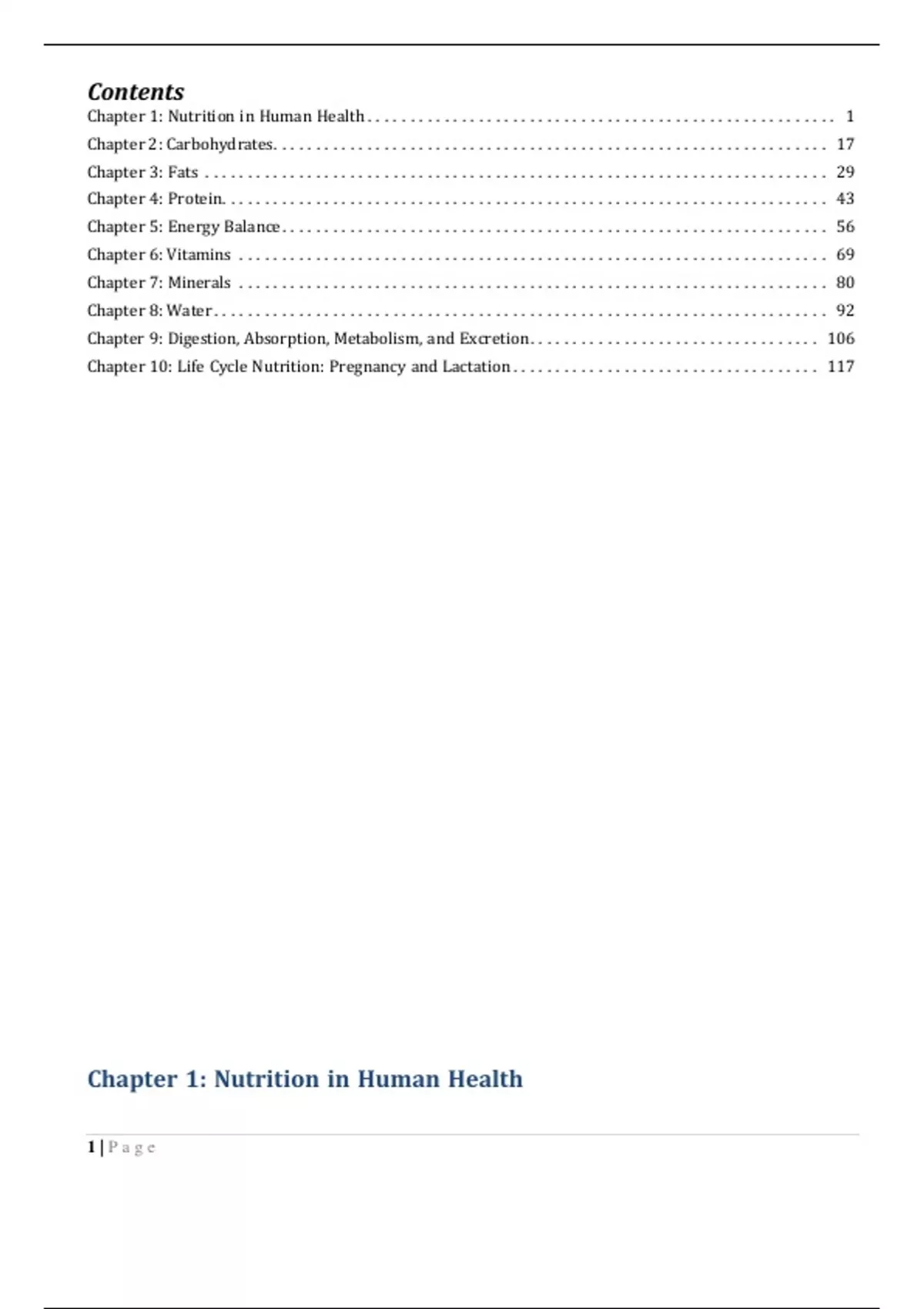 Test Bank Lutz’s Nutrition and Diet Therapy 6th Edition Mazur Litch Contents Chapter 1: Nutrition in Human Health ................................ ....................... 1 Chapter 2: Carbohydrates................................ ................................ . 17 Chapter 3: Fats ................................ ................................ ......... 29 Chapter 4: Protein ................................ ................................ ....... 43 Chapter 5: Energy Balance ................................ ................................ 56 Chapter 6: Vitamins ................................ ................................ ..... 69 Chapter 7: Minerals ................................ ................................ ..... 80 Chapter 8: Water ................................ ................................ ........ 92 Chapter 9: Digestion, Absorption, Metabolism, and Excretion ................................ .. 106 Chapter 10: Life Cycle Nutrition: Pregnancy and Lactation ................................ .... 117 Chapter 1: Nutrition in Human Health 1 | P a g e1. Dietary guidelines are intended to: 1. Apply to the food intake for a single day 2. Apply to items to be ingested for one meal 3. Apply to people who are ill 4. Aid in preventing chronic and degenerative diseases Ans: 4 Feedback 1. 2. 3. 4. Dietary guidelines are intended to evaluate several days’ intake of food. Dietary guidelines are intended to evaluate several days’ intake of food, not a single meal or the intake for 1 day. Dietary guidelines focus on healthy individuals aged 2 years and older. KEY: Integrated Process: Nursing Process | Client Need: Physiological Integrity: Basic Care and Comfort | Cognitive Level: Comprehension Dietary guidelines, which focus on healthy individuals from age 2 years on, are also aimed at those at risk for chronic disease to encourage proper dietary habits to promote health and reduce the risk for major chronic diseases. 2. After reviewing the concept of nutrients, a nursing student demonstrates the need for additional study if the student identifies which of the following as a class of nutrients? 1. Alcohol 2. Carbohydrate 3. Fat 4. Protei n Ans: 1 Feedback 1. 2. 3. 4. Alcohol is not considered a nutrient. Carbohydrates are one of the six classes of nutrients. Other classes include fats, proteins, vitamins, minerals, and water. Fat is one of the six classes of nutrients. Other classes include carbohydrates, proteins, vitamins, minerals, and water. KEY: Integrated Process: Teaching/Learning | Client Need: Physiological Integrity: Basic Care and Comfort | Cognitive Level: Analysis Protein is one of the six classes of nutrients. Other classes include carbohydrates, fats, vitamins, minerals, and water. 2 | P a g e3. A chemical substance required by the body is called a(n): 1. Additive 2. Vitamin 3. Food 4. Phytochemic al Ans: 2 Feedback 1. 2. 3. 4 An additive, as the name implies, is a substance that is not normally present but added to a food. Vitamins are nutrients, which are chemical substances required by the body. Food is essential to life, but it is not considered a chemical substance. KEY: Integrated Process: Nursing Process | Client Need: Physiological Integrity: Basic Care and Comfort | Cognitive Level: Knowledge A phytochemical is a physiologically active substance from a plant source that can help promote health. 4. A substance found in food that must be present in the diet because the human body lacks the ability to manufacture it in sufficient amounts for optimal health is called a(n): 1. Phytochemical 2. Essential nutrient 3. Conditional nutrient 4. Nonessential nutrient Ans: 2 Feedback 1. 2. 3. 4. A phytochemical is a physiologically active substance from a plant source that can help to promote health. An essential nutrient is one that the human body requires but cannot manufacture in sufficient amounts to meet the body’s needs. A conditionally essential nutrient is one that, under most circumstances, the healthy body can manufacture in sufficient quantities. KEY: Integrated Process: Nursing Process | Client Need: Physiological Integrity: Basic Care and Comfort | Cognitive Level: Comprehension A nonessential nutrient is one that is not needed in the diet because the body can make it from other substances. 3 | P a g e5. Which of the following statements by a client would indicate a need for nutritional instruction? 1. “The six classes of nutrients are carbohydrates, fats, proteins, vitamins, minerals, and water.” 2. “Nutrition can affect health positively or negatively.” 3. “Excessive intake of a nutrient can interfere with other nutrients.” 4. “Milk is the perfect food containing all essential nutrients.” Ans: 4 Feedback 1. 2. 3. 4. The six classes of nutrients are carbohydrates, fats, proteins, vitamins, minerals, and water. Health is dependent on nutrition; the effect can be positive or negative. If a person ingests too much of one nutrient, other nutrients can be affected. Milk is not the perfect food. It does not contain all of the essential nutrients that a person needs. KEY: Integrated Process: Teaching/Learning | Client Need: Physiological Integrity: Basic Care and Comfort | Cognitive Level: Analysis 6. Metabolism is best described as: 1. The sum of all physical and chemical changes that take place in the body 2. A state of complete physical, mental, and social well-being 3. Chemical substances needed for growth, maintenance, and repair 4. The acceleration and deceleration of body functions Ans: 1 Feedback 1. 2. 3. 4. Metabolism is a term that refers to the sum of all physical and chemical changes that take place in the body. Health is a term that refers to a complete state of physical, mental, and social well-being. Nutrients are chemical substances supplied by food that the body needs for growth, maintenance, and repair. KEY: Integrated Process: Nursing Process | Client Need: Physiological Integrity: Basic Care Metabolism does not refer t
