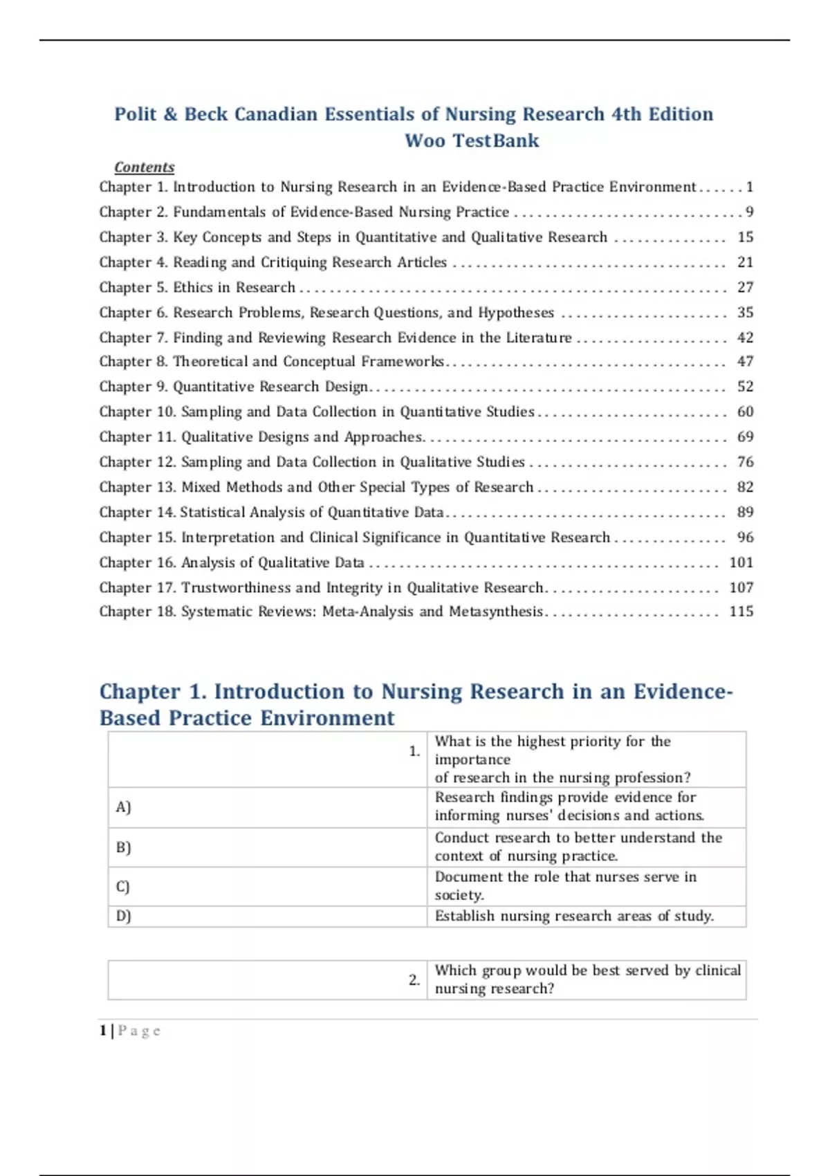 Test Bank Polit & Beck Canadian Essentials of Nursing Research 4th Edition Woo Contents Chapter 1. Introduction to Nursing Research in an Evidence-Based Practice Environment ...... 1 Chapter 2. Fundamentals of Evidence-Based Nursing Practice .............................. 9 Chapter 3. Key Concepts and Steps in Quantitative and Qualitative Research ............... 15 Chapter 4. Reading and Critiquing Research Articles ................................ .... 21 Chapter 5. Ethics in Research ................................ ........................ 27 Chapter 6. Research Problems, Research Questions, and Hypotheses ...................... 35 Chapter 7. Finding and Reviewing Research Evidence in the Literature .................... 42 Chapter 8. Theoretical and Conceptual Frameworks ................................ ..... 47 Chapter 9. Quantitative Research Design................................ ............... 52 Chapter 10. Sampling and Data Collection in Quantitative Studies ......................... 60 Chapter 11. Qualitative Designs and Approaches ................................ ........ 69 Chapter 12. Sampling and Data Collection in Qualitative Studies .......................... 76 Chapter 13. Mixed Methods and Other Special Types of Research ......................... 82 Chapter 14. Statistical Analysis of Quantitative Data ................................ ..... 89 Chapter 15. Interpretation and Clinical Significance in Quantitative Research ............... 96 Chapter 16. Analysis of Qualitative Data ................................ .............. 101 Chapter 17. Trustworthiness and Integrity in Qualitative Research ....................... 107 Chapter 18. Systematic Reviews: Meta-Analysis and Metasynthesis ....................... 115 Chapter 1. Introduction to Nursing Research in an EvidenceBased Practice Environment 1. A) B) C) D) 2. 1 | P a g e What is the highest priority for the importance of research in the nursing profession? Research findings provide evidence for informing nurses' decisions and actions. Conduct research to better understand the context of nursing practice. Document the role that nurses serve in society. Establish nursing research areas of study. Which group would be best served by clinical nursing research?A) B) C) D) Nursing administrators Practicing nurses Nurses' clients Healthcare policymakers 3. A) B) C) D) 4. A) B) C) D) 5. In the United States, in what area does research play an important role in nursing? Chronic illness Credentialing and status Nurses' personalities Nurses' education What is the role of a consumer of nursing research? Read research reports for relevant findings. Participate in generating evidence by doing research. Participate in journal club in a practice setting. Solve clinical problems and make clinical decisions. What was the concern of most nursing studies in the early 1900s? 2 | P a g eA) B) C) D) Client satisfaction Clinical problems Health promotion Nursing education 6. A) B) C) D) Which topic most closely conforms to the priorities that have been suggested for future nursing research? Attitudes of nursing students toward smoking. Promotion of excellence in nursing science. Nursing staff morale and turnover. Number of doctorate prepared nurses in various clinical specialties. 7. What is the process of deductive reasoning? A) B) C) D) 8. A) B) C) D) 9. A) 3 | P a g e Verifying assumptions that are part of our heritage. Developing specific predictions from general principles. Empirically testing observations that are made known through our senses. Forming generalizations from specific observations. What is the ontological assumption of those espousing a naturalistic paradigm? Objective reality and those natural phenomena are regular and orderly. Phenomena are not haphazard and result from prior causes. Reality is multiply constructed and multiply interpreted by humans. Reality is not fixed, but is rather a construction of human minds. What is the epistemological assumption of those espousing a positivist paradigm? The researcher is objective and independent of those being studied.B) Phenomena are not haphazard, but rather have antecedent causes. 4 | P a g eC) The researcher instructs those being studied to be objective in providing information. D) 10. A) B) C) D) Reality is not fixed, but is rather a construction of human minds. Which is not a characteristic of traditional scientific method? Control over external factors. Systematic measurement and observation of natural phenomena. Deductive reasoning. Emphasis on a holistic view of a phenomenon, studied in a rich context. 11. What is empiricism? A) B) C) D) Making generalizations from specific observations. Deducing specific predictions from generalizations. Gathering evidence rooted in reality. Verifying the assumptions on which the study was based. A) B) C) D) 12. What is a hallmark of the scientific method? Infallible Holistic Systematic Flexible 13. A) B) C) D) Which of the following limits the power of the scientific method to answer questions about human life? The necessity of departing from traditional beliefs. The difficulty of accurately measuring complex human traits. The inability to control potential biases. The shortage of theories about human behavior. 5 | P a g eA) B) C) D) 14. What is a criticism of the scientific method? Deductive Deterministic Empirical Reductionist 15. A) B) C) D) What is involved in naturalistic qualitative research? Involves deductive processes Takes places in the field. Focuses on the idiosyncrasies of those being studied. Attempts to control the research context to better understand the phenomenon being studied. 16. A) B) C) D) A researcher wants to investigate the effect of patients' body position on blood pressure. This is an example of what type of study? Qualitative Constructivist inquiry Quantitative Researcher preference of either quantitative or qualitative 17. A) B) C) D) A researcher is studying the effect of massage on the alleviation 