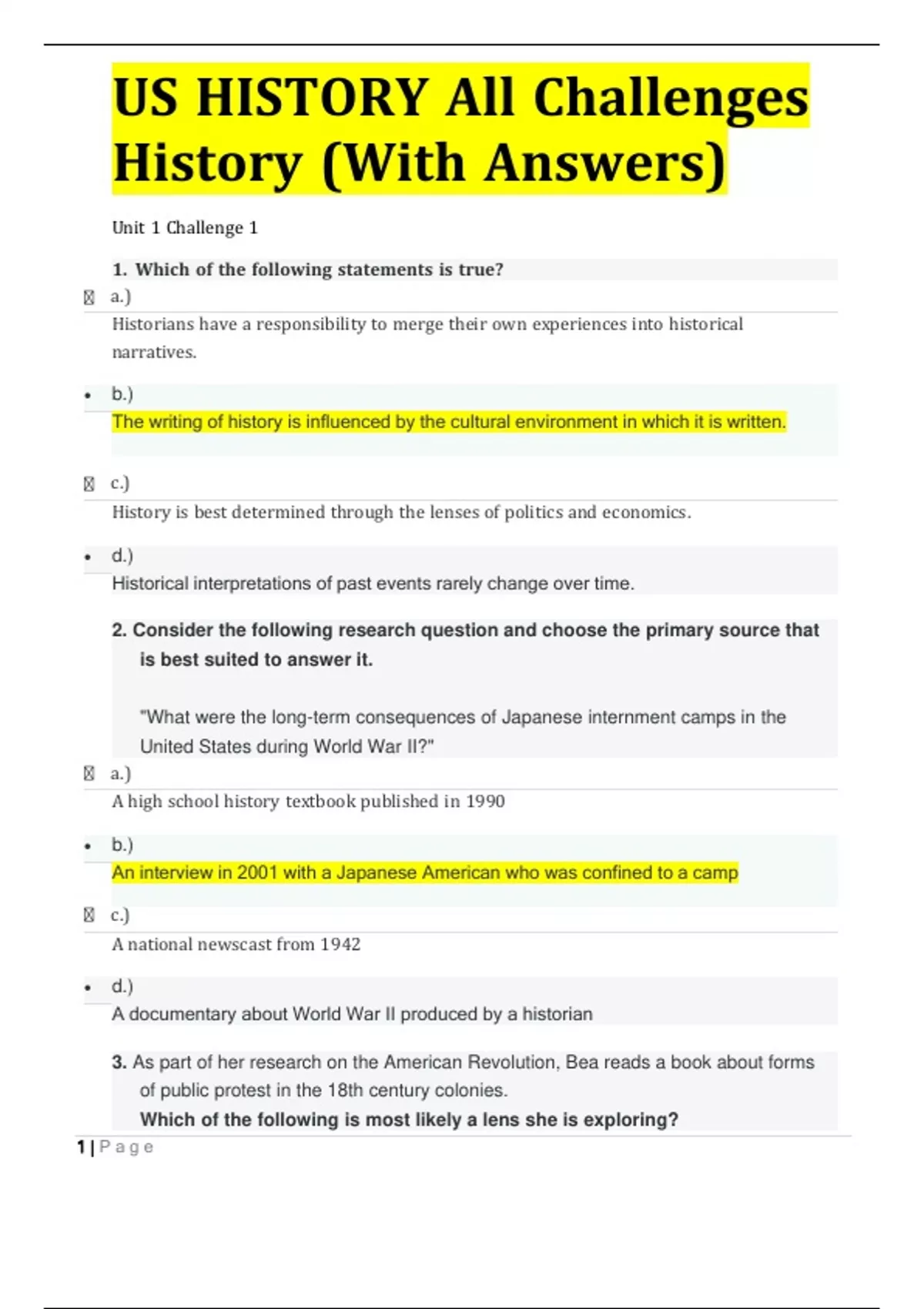 US HISTORY All Challenges History (With Answers) Unit 1 Challenge 1 1. Which of the following statements is true? a.) Historians have a responsibility to merge their own experiences into historical narratives. • b.) The writing of history is influenced by the cultural environment in which it is written. c.) History is best determined through the lenses of politics and economics. • d.) Historical interpretations of past events rarely change over time. 2. Consider the following research question and choose the primary source that is best suited to answer it. "What were the long-term consequences of Japanese internment camps in the United States during World War II?" a.) A high school history textbook published in 1990 • b.) An interview in 2001 with a Japanese American who was confined to a camp c.) A national newscast from 1942 • d.) A documentary about World War II produced by a historian 3. As part of her research on the American Revolution, Bea reads a book about forms of public protest in the 18th century colonies. Which of the following is most likely a lens she is exploring? 1 | P a g ea.) Race b.) Ethics c.) Politics d.) Economics Which native civilization lived in permanent settlements made up of apartment- like complexes of stone and mud? • a.) The Pueblo b.) The Aztec c.) The Olmec • d.) The Hopewell Which of the following historians is collecting oral history? a.) Hajit makes detailed drawings of prehistoric images found on boulders in Minnesota. b.) Hector analyzes one of the first maps made by European explorers. c.) Hope attempts to translate symbols on a pot that she believes were a form of writing. • d.) Helen interviews contemporary Native Americans about their cultural traditions. Which statement is most representative of the French approach toward native peoples in the Americas? a.) "Your territory belongs to us by decree of the Catholic Church." b.) "The natives will submit to the absolute authority of the Crown." c.) 2 | P a g e"Gift exchanges with natives will forge alliances and establish trade relationships." d.) "The natives, although poor, show ingenuity and will welcome friendship with a superior civilization." Which of the following events led to increased maritime exploration in the 15th century? a.) The Crusades of the 11th, 12th and 13th centuries b.) Discoveries by the Vikings c.) The invention of the printing press • d.) Competition between Catholics and Protestants European traders discovered that they could sell chocolate from the New World back home in Europe. Which of the following concepts does this statement best exemplify? a.) Globalization b.) Colonization • c.) Commodification Which of the following statements is true about slavery prior to the Atlantic slave trade? a.) It could involve one person bonding himself to another so as to work off a debt. b.) Slaves were almost always considered to be the property of their masters. c.) It was largely an issue of race, as only people with darker skin could become slaves. 3 | P a g ed.) A person's religion had no impact on whether he or she could be enslaved. In 1540, Francisco Vásquez de Coronado set out to find the rumored golden city of Quivira. What came of his expedition? a.) Despite a two-year expedition that got as far north as modern-day Kansas, Coronado never found Quivira. b.) Quivira was discovered near present-day Albuquerque, stripped of its wealth and ultimately abandoned. c.) Quivira was found in modern-day Oklahoma, but its wealth had been greatly exaggerated in the rumors. • d.) Coronado's expedition ended prematurely after a particularly brutal winter in the Rocky Mountains. What was a significant factor in the demise of Dutch settlements in the Americas? a.) Internal struggles back in Holland b.) Too few European settlers c.) Territorial disputes with France • d.) Conflict with native peoples Interactions between Native Americans and Europeans led to the commercialization of traditional beaver-hunting practices. Which of the following factors played the biggest role in that change? a.) 4 | P a g eEuropeans introduced the concept of private ownership of hunting lands. b.) Europeans introduced capitalism and ideas about success through hard work. c.) Europeans were willing to give Native Americans muskets in exchange for beaver pelts. d.) Europeans brought new animals that made it easier to hunt for beavers. Which of the following statements is characteristic of Martin Luther's position in 1517? a.) "I declare myself to be the head of the Catholic Church in my country." b.) "Individual monarchs have too much power." c.) "Reading scripture prepares people to receive God's grace if they are among the elect." • d.) "The practice of selling indulgences is corrupt and has to stop." What role did European exports play in the Triangular Trade? a.) Guns and gunpowder from Europe were exchanged for sugar in Africa. b.) Slaves would be brought from Europe to the Americas in exchange for textiles, rum and other goods. c.) Rum was used to lure Africans into the voyage to America, where they would then be forced into slavery. • d.) Manufactured goods were used to buy African slaves from other Africans who captured them. Which statement is most representative of the French approach toward native peoples in the Americas? 5 | P a g ea.) "Your territory belongs to us by decree of the Catholic Church." b.) "The natives will submit to the absolute authority of the Crown." c.) "Gift exchanges with natives will forge alliances and establish trade relationships." d.) "The natives, although poor, show ingenuity and will welcome friendship with a superior civilization." "Unlike other colonists, these men and women were motivated by religion and a desire to create a successful community." Which English colony is most likely being described here? • a.) Massachusetts Bay b.) Roanoke c.) Jamestown d.) Virginia Which factor led to the implementation of the Headright System? a.) Abundant l