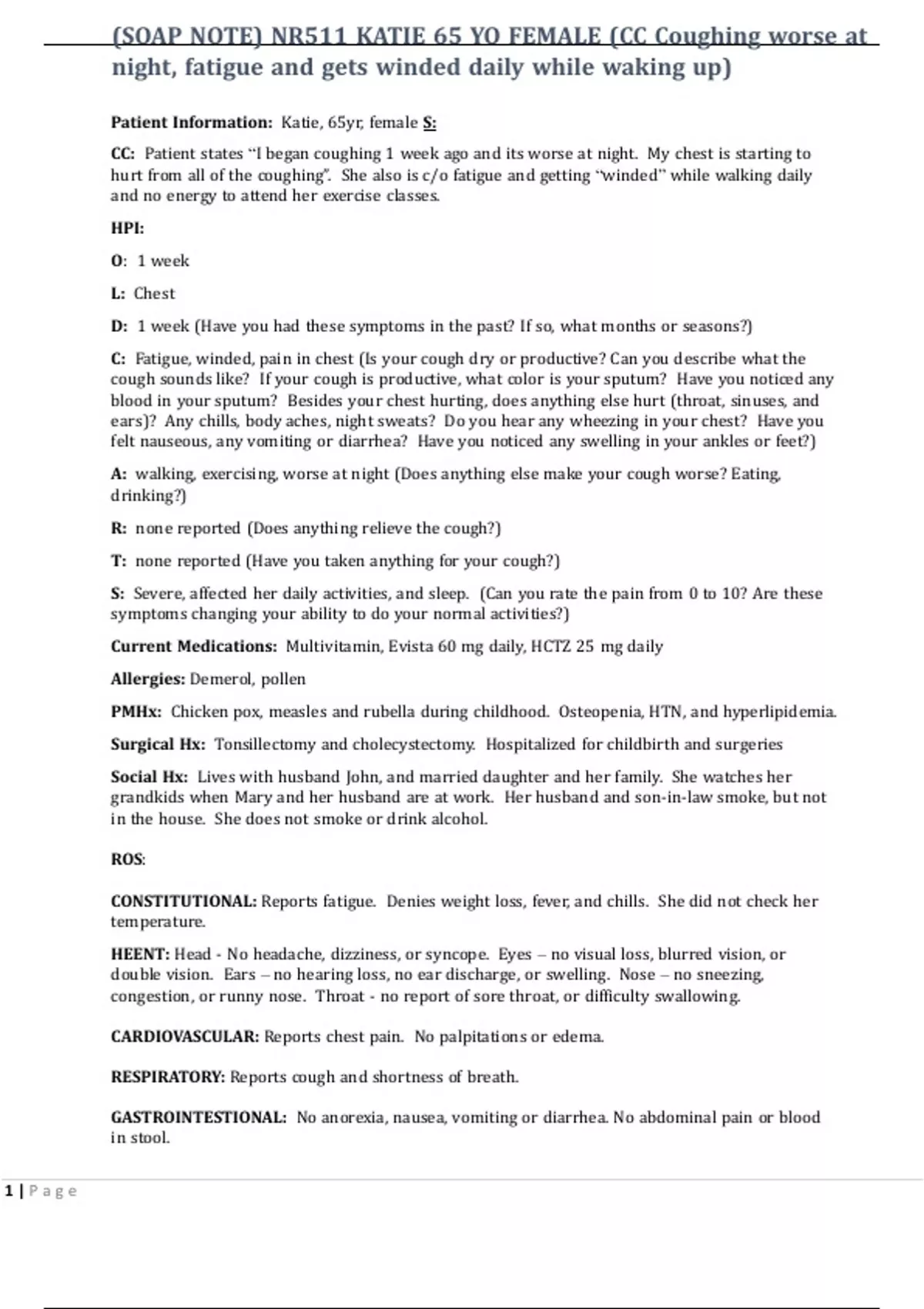 (SOAP NOTE) NR511 KATIE 65 YO FEMALE (CC Coughing worse at night, fatigue and gets winded daily while walking)
