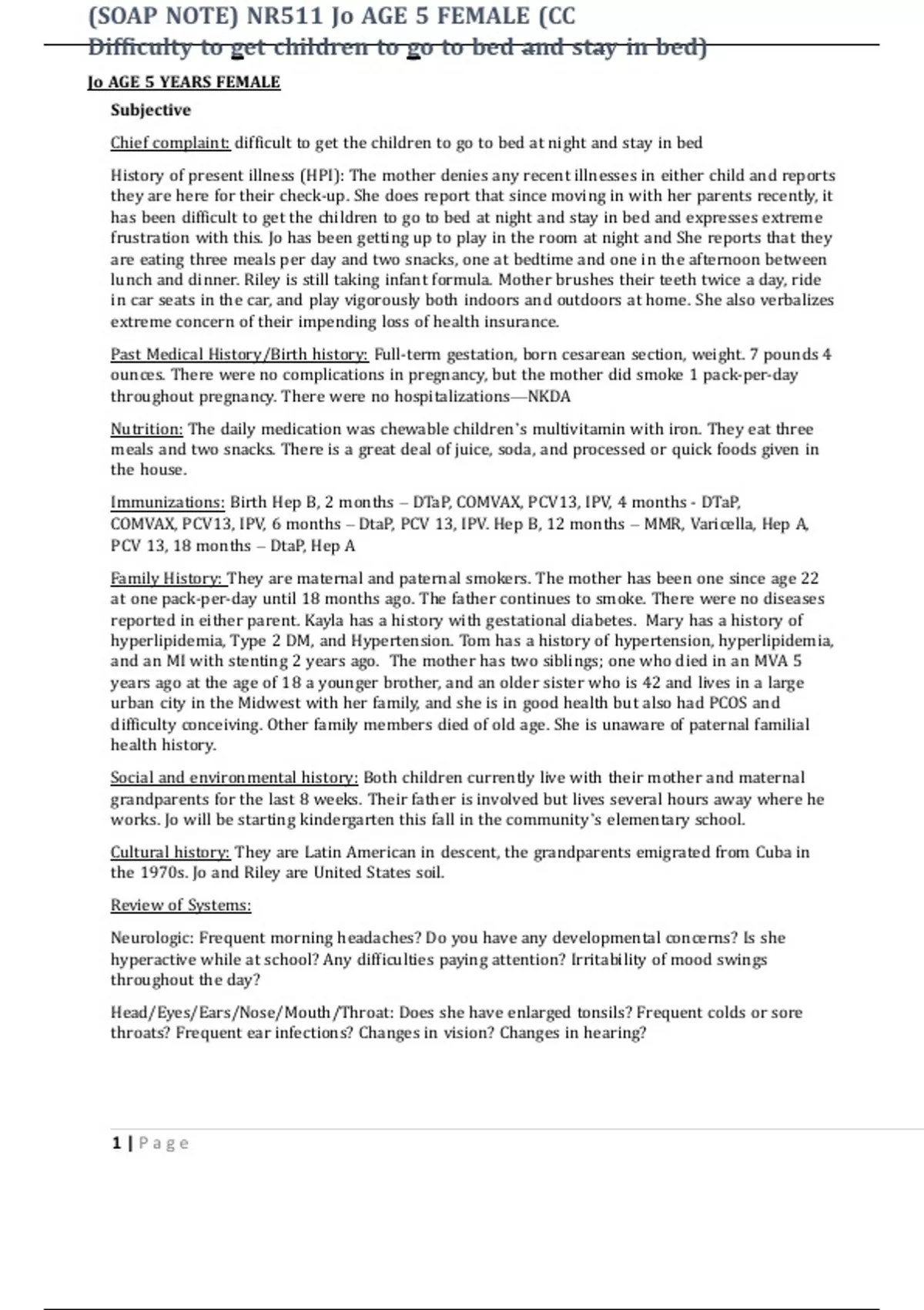 (SOAP NOTE) NR511 Jo AGE 5 FEMALE (CC Difficult to get children to bed at night and stay in bed) Jo AGE 5 YEARS FEMALE Subjective Chief complaint: difficult to get the children to go to bed at night and stay in bed History of present illness (HPI): The mother denies any recent illnesses in either child and reports they are here for their check-up. She does report that since moving in with her parents recently, it has been difficult to get the children to go to bed at night and stay in bed and expresses extreme frustration with this. Jo has been getting up to play in the room at night and She reports that they are eating three meals per day and two snacks, one at bedtime and one in the afternoon between lunch and dinner. Riley is still taking infant formula. Mother brushes their teeth twice a day, ride in car seats in the car, and play vigorously both indoors and outdoors at home. She also verbalizes extreme concern of their impending loss of health insurance. Past Medical History/Birth history: Full-term gestation, born cesarean section, weight. 7 pounds 4 ounces. There were no complications in pregnancy, but the mother did smoke 1 pack-per-day throughout pregnancy. There were no hospitalizations—NKDA Nutrition: The daily medication was chewable children’s multivitamin with iron. They eat three meals and two snacks. There is a great deal of juice, soda, and processed or quick foods given in the house. Immunizations: Birth Hep B, 2 months – DTaP, COMVAX, PCV13, IPV, 4 months - DTaP, COMVAX, PCV13, IPV, 6 months – DtaP, PCV 13, IPV. Hep B, 12 months – MMR, Varicella, Hep A, PCV 13, 18 months – DtaP, Hep A Family History: They are maternal and paternal smokers. The mother has been one since age 22 at one pack-per-day until 18 months ago. The father continues to smoke. There were no diseases reported in either parent. Kayla has a history with gestational diabetes. Mary has a history of hyperlipidemia, Type 2 DM, and Hypertension. Tom has a history of hypertension, hyperlipidemia, and an MI with stenting 2 years ago. The mother has two siblings; one who died in an MVA 5 years ago at the age of 18 a younger brother, and an older sister who is 42 and lives in a large urban city in the Midwest with her family, and she is in good health but also had PCOS and difficulty conceiving. Other family members died of old age. She is unaware of paternal familial health history. Social and environmental history: Both children currently live with their mother and maternal grandparents for the last 8 weeks. Their father is involved but lives several hours away where he works. Jo will be starting kindergarten this fall in the community’s elementary school. Cultural history: They are Latin American in descent, the grandparents emigrated from Cuba in the 1970s. Jo and Riley are United States soil. Review of Systems: Neurologic: Frequent morning headaches? Do you have any developmental concerns? Is she hyperactive while at school? Any difficulties paying attention? Irritability of mood swings throughout the day? Head/Eyes/Ears/Nose/Mouth/Throat: Does she have enlarged tonsils? Frequent colds or sore throats? Frequent ear infections? Changes in vision? Changes in hearing? 1 | P a g eIntegumentary: Any rashes, reports of itching, change in pigmentation, excessive moisture or dryness, presence of wounds, presence of invasive devices, alterations in texture, changes in hair growth, texture or loss, nail changes, tenderness, no swelling Cardiovascular: cyanosis and dyspnea, heart murmurs, exercise tolerance, squatting, chest pain, palpitations Respiratory: Does she mouth breath or have trouble breathing through the nose? Asthma? Genitourinary: Any urgency, frequency of urination at night? Any blood in the urine? Endocrine: Have you noticed excessive weight gain? Or failure to gain weight? Any increase in hunger, thirst, urination or problems with hot or cold environments? Gastrointestinal: Does she have difficulty swallowing and/or drooling? Have you had any complaints of nausea vomiting or stomach acid reflux? Do any of the following occur: changes in appetite, dysphagia, and indigestion, food intolerances to milk products, abdominal pain, heartburn, denies nausea, denies vomiting, denies hematemesis, no jaundice, or denies constipation? Musculoskeletal: Does she sleep walk? Any muscular disorders? Hematologic: Any prevalent genetic disease? Any bleeding problems in skin; excessive bruising. Exposure to toxins, any blood transfusions. Objective Vital signs: height: 110 centimeters 75th percentile; weight: 29 kilograms, BMI 24.0 (Normal 18.5- 25) BMI percentile is 95% B/P:102/60, T: 98.2, HR: 94 BMP/reg., Resp: 18, reg, nonlabored, SpO2: 99% General: Cooperative, talkative, appropriate; HEENT: head normocephalic atraumiatic, hair thick and distributed throughout entire scalp; Conjunctiva clear, non-icteric, PERRLA, EOM’s intact; fundoscopic exam unremarkable; vision by Snellen exam 20/40 in each eye, 20/30 together; tympanic membranes intact, unremarkable; pinna/tragus w/o tenderness; nares patent, unremarkable bil; pharynx unremarkable tonsils 2/4 bil; primary tooth eruption to include first molars upper and lower; no loose teeth; oral exam unremarkable; neck supple w/o lymphadenopathy; thyroid small, firm, equal bilateral Cardiopulmonary: Heart RRR w/o murmur; lungs CTA throughout; respirations even and unlabored; abdomen sl. rounded normoactive bowel sounds throughout, soft, non-tender, no masses, or organomegaly; peripheral pulses reg., equal., intact bil radial and pedal; GU – labia majora and minora intact, no erythema or discharge. Tanner 1 breasts and pubic area. Musculoskeletal: MAE. Able to do deep knee bends; hop on one foot on right leg but not left with any balance, tries but tumbles; able to balance on each leg for 10 seconds. Cognitive Development: Able to state name and age; can write her own name; able to recall three friends names; knows all colors and can count to 13; dresses hers